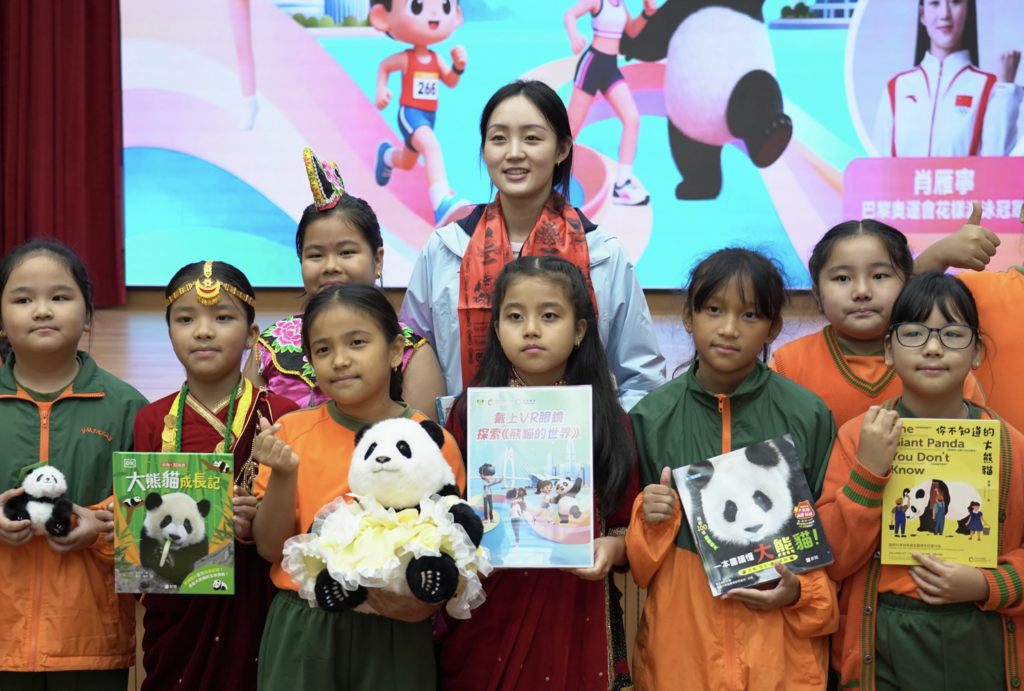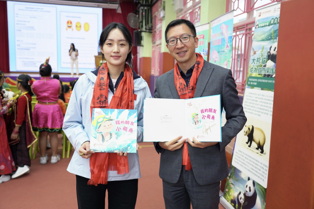 活动尾声,肖雁宁一行向孩子们派发奥运和熊猫贴纸,为《闪光少年体育绘本:我的朋友小飞鱼》《一本书读懂大熊猫》《你不知道的大熊猫》等签名,参观中华文化有意思“第十五届全运会”主题展板,并体验“大熊猫的世界”VR作品,在VR世界中与熊猫互动。临别前,肖雁宁与孩子们牵手告别,她鼓励同学们在运动中寻找属于自己的节奏,在坚持中发现快乐,并为香港运动健儿加油!