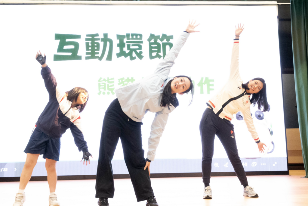 活动首站“奥运人生与熊猫情缘——大熊猫公益巡讲”于圣公会主爱小学展开,代表团受到师生们的热烈欢迎。中国花样游泳奥运冠军肖雁宁与在场师生分享了自己由8岁初识花样游泳,直到走向奥运冠军领奖台的心路历程,以亲身经历勉励学生勇敢追梦,亦鼓励同学们积极参与公益活动。分享结束后,肖雁宁与学生代表同台竞技,一起体验电竞单车的快乐,之后又进入课室与同学们亲切互动。