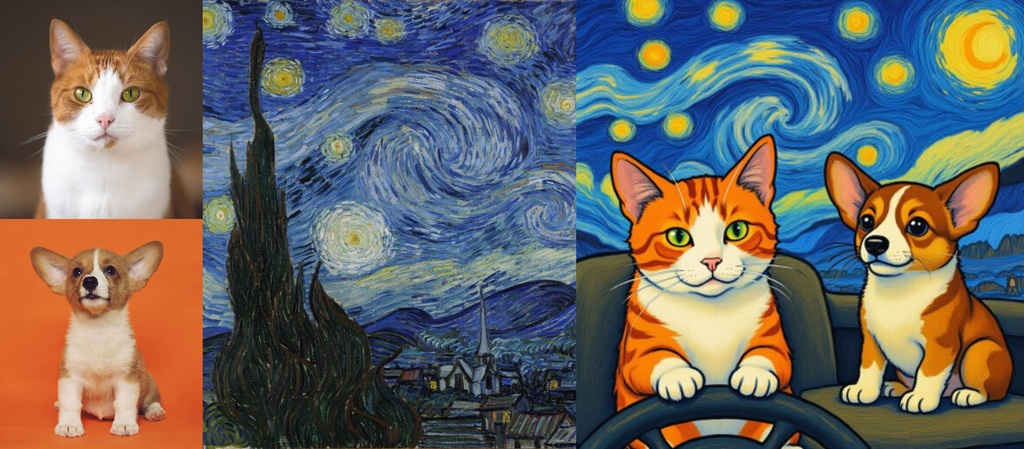 在多模态生成任务中,需求是“图 1 中的猫与图 2 中的狗并排坐著,背景设定在车内,且生成图像的风格需与图 3 保持一致。”——DreamOmni2 不仅保持了图1图2原有的动物毛发特征,像图3一样的绘画风格,融合之后的背景色彩也十分一致。