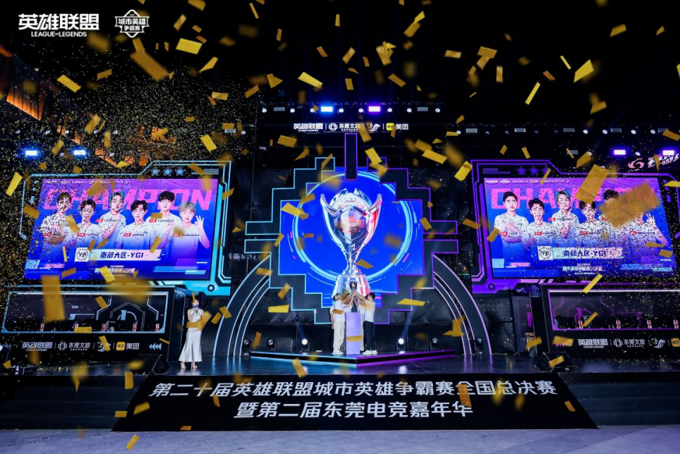 2025年10月26日,东莞赛至夜晚,灯光纷繁,在东莞万江华南MALL广场,伴随着全场观众的沸腾欢呼与漫天飞舞的金色雨丝,第二十届英雄联盟城市英雄争霸赛全国总决赛巅峰对决帷幕终落。经过两天的激烈角逐,南部大区Ygi战队(YGI)战队最终捧起象征至高荣誉的冠军奖杯,为这场首次落户东莞的腾讯官方大众赛道超级赛事画上圆满句号。