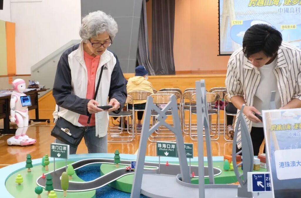 典礼结束后,高科技体验活动随即展开。现场设置了十余个互动项目,包括AI机械人互动、“三剑三舰”MR空间、“中华飞天梦”MR空间、港珠澳大桥模型游戏、高科技手工“全息投影”及“纸杯火箭”制作、主题电子阅读区与纸本书阅读区等,更引入了近期广受欢迎的“VR大空间体验”。