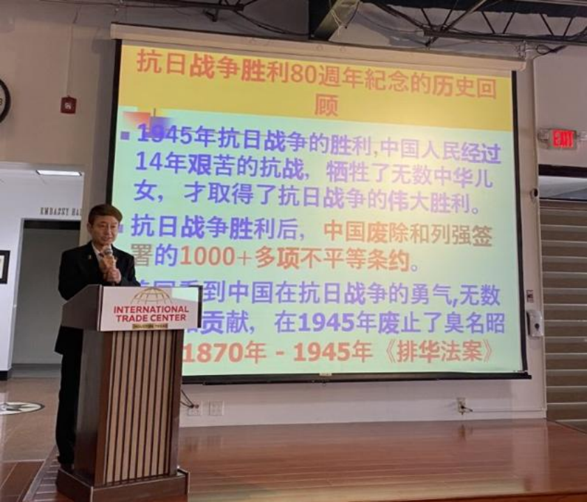 德州两岸时事论坛社副社长浦浩德博士以图片和视频的方式,回顾了抗日战争十四年的艰苦岁月。他强调,正是因为中国在抗击法西斯战争中的巨大牺牲和胜利,才得以被废除一千多条不平等条约,以及被废止从1870年到1945年长达75年、臭名昭著的《排华法案》。在播放了1945年北平受降仪式的纪念视频后,他提醒要深深认识台湾的命运与祖国的命运紧密项链、休戚相关。他呼吁团结起来,实现中华民族的伟大复兴,这样才能给包括台湾同胞在内的全体中华儿女带来安全、尊严和自立于世界民族之林的荣耀。