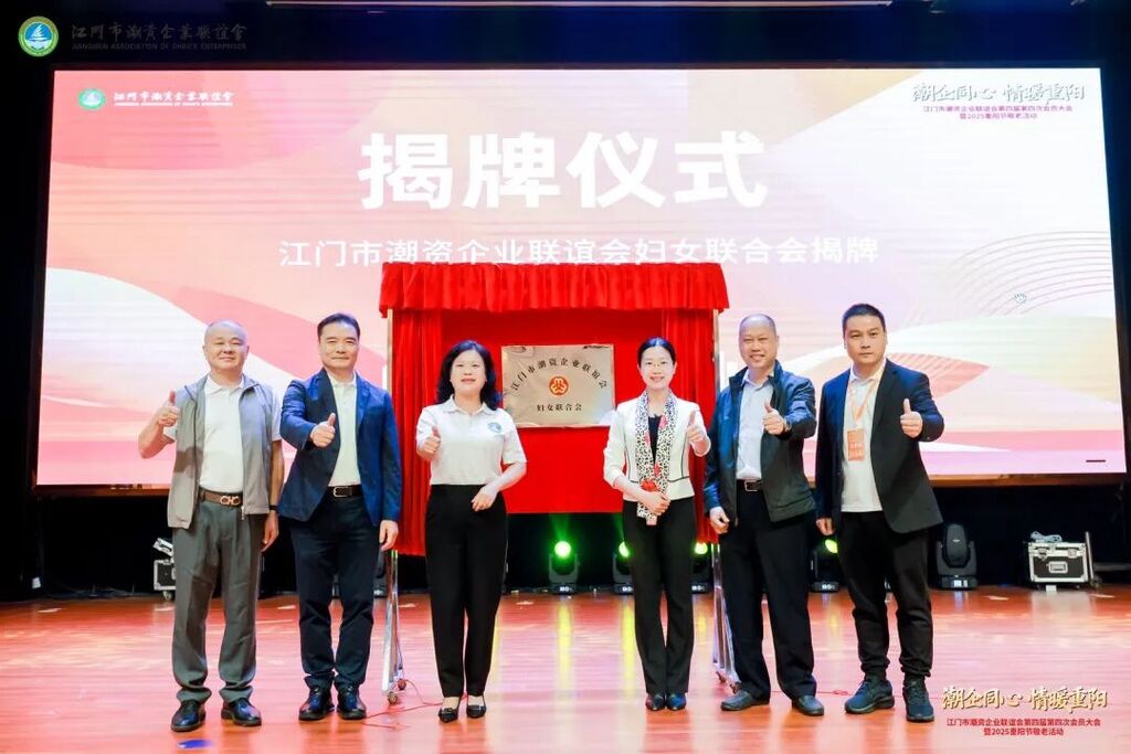 江门市妇联党组书记、主席颜海娜,市民政局党组成员、市社会组织党委专职副书记林靖,商会会长谢俊波,执行会长吕伟波,常务副会长兼党支部书记郭贤镇,常务副会长兼妇联主席郑爱叶共同为商会妇联成立揭牌