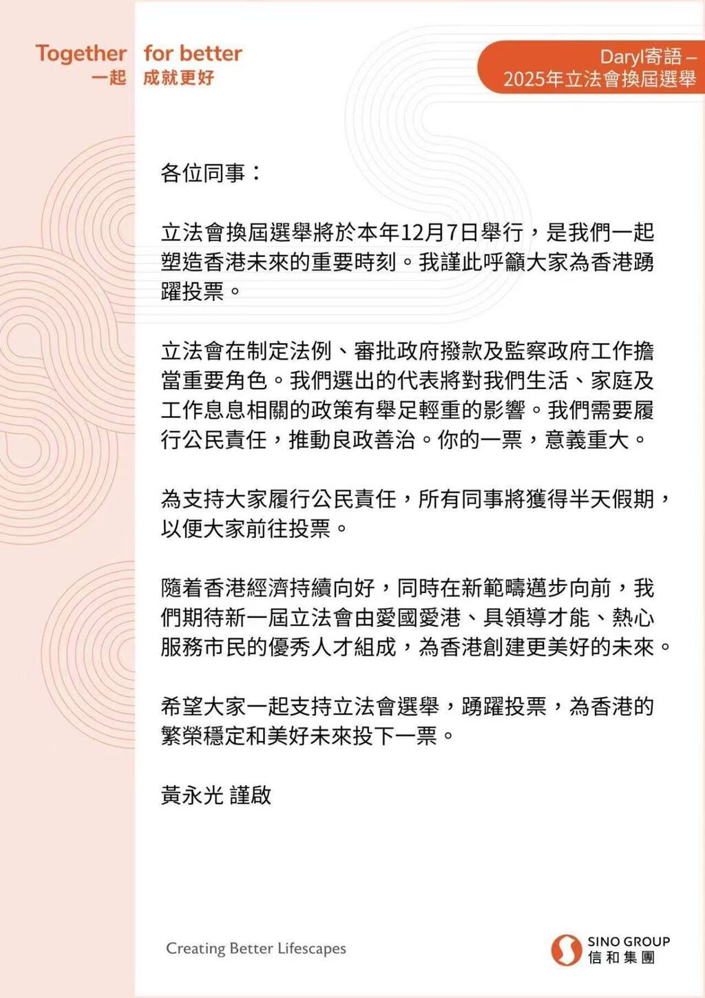 黄永光在致全体员工的信中强调:“立法会换届选举将于今年12月7日举行,这将是我们共同塑造香港未来的关键时刻。我诚挚呼吁各位为香港踊跃投票。”他进一步指出,立法会在法律制定、政府拨款审议及监督政府运作方面发挥著重要作用。我们所选出的代表,将对与我们生活、家庭及工作密切相关的政策产生深远影响。履行公民责任,共同促进良政善治,是我们共同的使命。