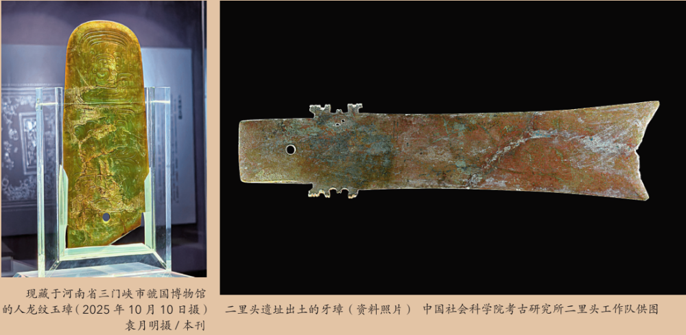 在河南省三门峡市虢国博物馆展厅中央,出土于西周晚期虢国国君虢仲墓的人龙纹玉璋,被静静置于独立展柜中,发出幽幽的青辉。