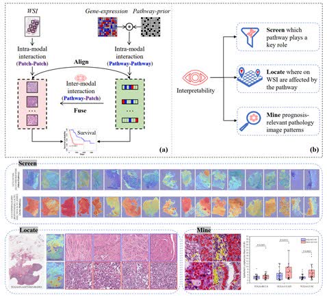 据介绍,癌症生存分析是精准医学的关键环节,它能帮助医生制定个性化治疗方案,但传统分析方法一直面临“病理图像和基因表达之间细粒度交互不足”的难题。过去的研究当中,仅用基因表达数据或病理图像单一模态预测生存,往往无法完整反映癌症的复杂机制;部分方法曾尝试结合两种模态,但依然忽略了基因功能网络与病理图像区域之间的细粒度关联,导致预测效果受限。