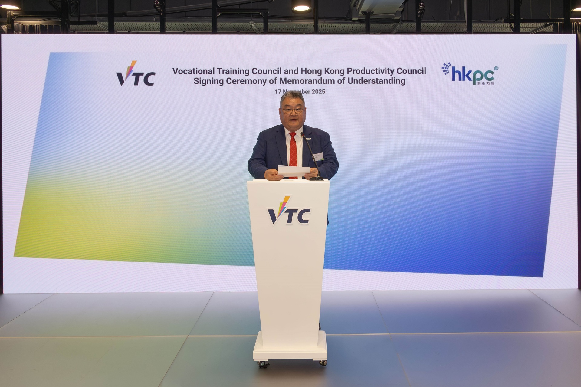 是次合作备忘录的签署仪式于昨日(11月17日)在VTC企业共创中心举行,在VTC主席戴泽棠及生产力局副主席于健安的见证下,由VTC执行干事唐智强及生产力局总裁毕坚文代表签署。