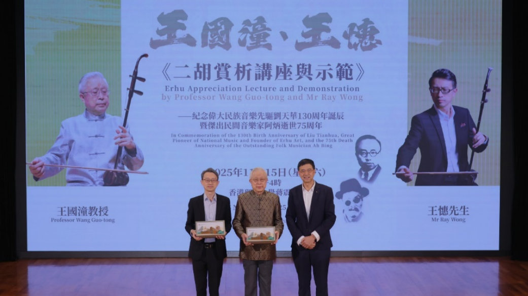 香港理工大学(理大)于2025年11月15日在蒋震剧院成功举办“王国潼、王憓《二胡赏析讲座与示范》——纪念伟大民族音乐先驱刘天华130周年诞辰暨杰出民间音乐家阿炳逝世75周年”活动,向两位对中国民族音乐发展贡献卓著的音乐巨匠致以深切崇敬。