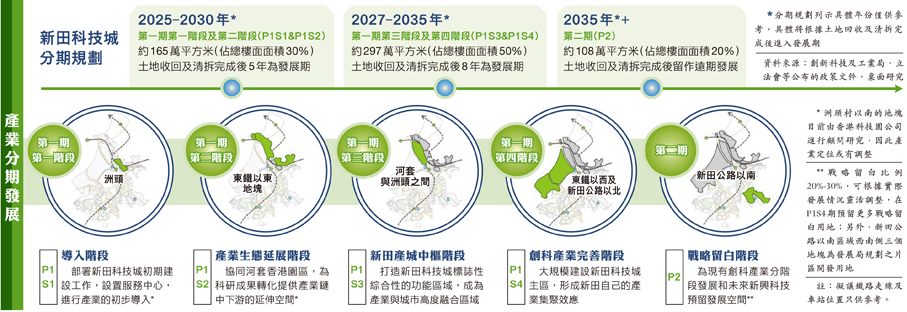 《纲要》提出的五个发展阶段包括:产业初步导入阶段;为科研成果转化提供产业链中下游延伸空间的产业生态延展阶段;打造新田科技城标志性综合功能区域的新田产城中枢阶段;大规模建设新田科技城主区的产业完善阶段;以及最后预留发展弹性的战略留白阶段,以支援未来新兴科技产业。