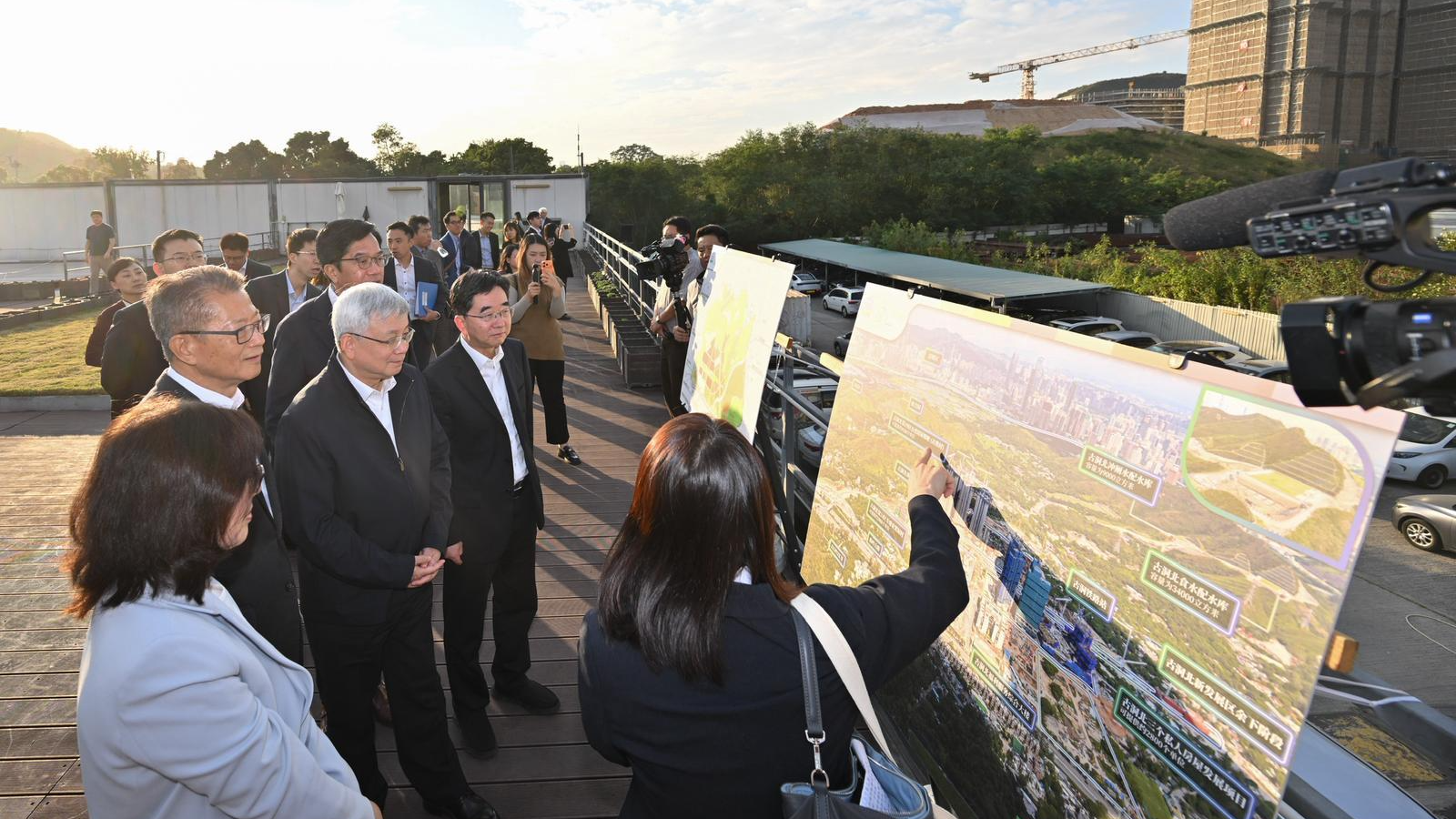 两位中央宣讲团成员首先到访古洞北新发展区,了解新发展区以至整个北部都会区的规划及建设情况。古洞北新发展区是北部都会区首个进入建造阶段的新发展区,以住宅社区及政府和社区设施为主。宣讲团到访了地盘办公楼,实地调研建设的情况。
