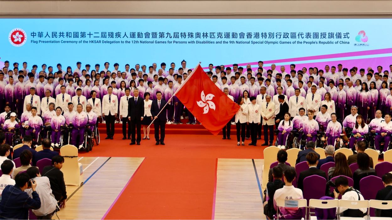 中华人民共和国第十二届残疾人运动会暨第九届特殊奥林匹克运动会香港特区代表团授旗仪式今日(11月24日)下午在调景岭体育馆举行。行政长官李家超为香港代表团授旗,各协助机构亦在仪式上获颁发感谢状,香港代表团团长文化体育及旅游局局长罗淑佩致辞,共同为香港运动员打气。