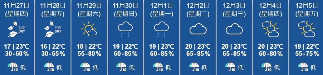 天文台表示,今晚北风逐渐增强。未来一两日持续天晴及非常乾燥。明日北风增强,星期五早上市区气温下降至15至16度左右,新界再低几度。星期六稍后渐转多云,随后一两日有一两阵雨。
