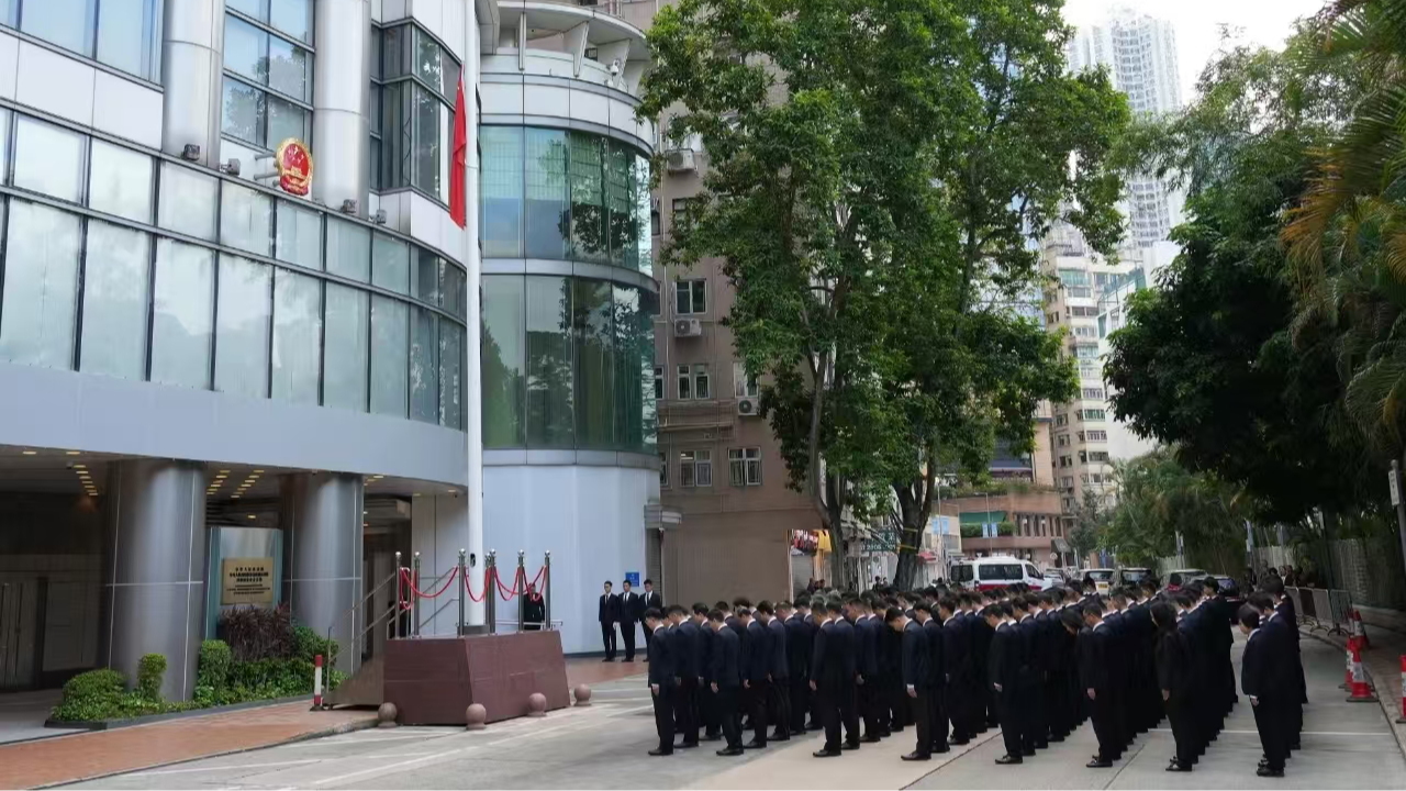 11月29日上午,驻港国家安全公署领导和干部代表在公署总部举行下半旗志哀仪式,全体干部肃立,默哀3分钟,沉痛哀悼在大埔宏福苑火灾中不幸罹难的人士。