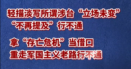 轻描淡写所谓涉台“立场未变”“不再提及”行不通。“日本国政府承认中华人民共和国政府是中国的唯一合法政府”,《中日联合声明》“是两国间和平友好关系的基础,联合声明所表明的各项原则应予严格遵守”,日方承诺“继续遵守日本在中日联合声明中表明的关于台湾问题的立场,重申中国只有一个”……日本政府在中日四个政治文件中就台湾问题作出的郑重承诺,具有国际法效力,没有任何模糊、曲解的空间。无论日本哪个党派、哪个人执政,都必须坚持和恪守。然而,高市上台不久,就狂妄叫嚣可能武力介入台海局势,公然侵害中国核心利益、严重伤害中国人民感情。如果日方在台湾问题上的立场没有改变,就应诚实、准确、完整地讲清其所谓“一贯立场”,坦坦荡荡公开承认台湾问题纯属中国内政,而不是像现在这样轻描淡写一笔带过,只提概念回避实质,妄图蒙混过关;或者以一句轻飘飘的“不再提及”淡化搪塞掩盖高市早苗的严重错误言论。这种掩耳盗铃、自说自话的做法,中方绝不接受。日方如果真心想发展中日战略互惠关系,构建契合新时代要求的建设性、稳定的中日关系,就应该恪守中日四个政治文件精神和所作政治承诺,立即收回错误言论,切实把对华承诺体现在实际行动上,而不是倒打一耙要求中方“保持克制”,给中方正当反制贴上“反应过度”标签。