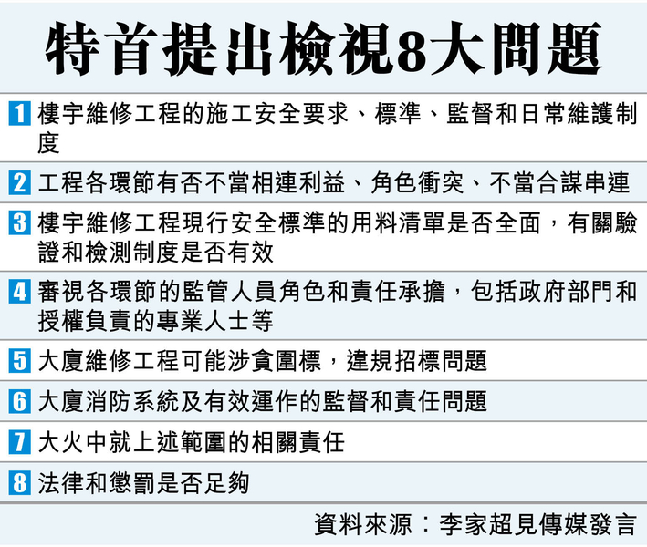 李家超提出,必须确保检视的8大问题,包括楼宇维修施工安全标准、维修工程用料清单及检测、涉贪围标及违规招标、大厦消防系统运作、大火相关责任,以及现有法例是否具备足够阻吓力等。他表示,将成立一个由法官主持的独立委员会负责调查工作。