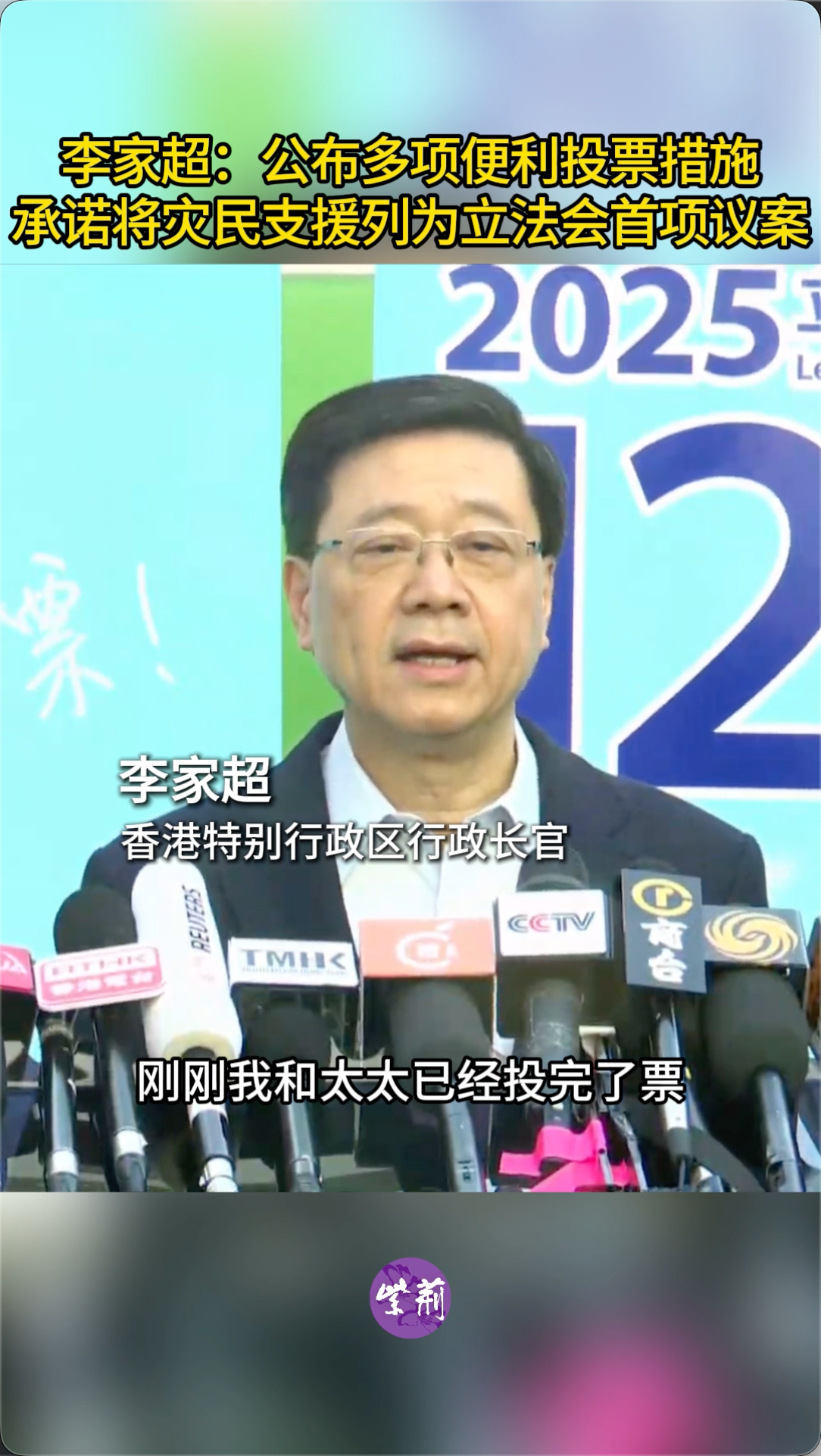 今日(7日)是香港立法会换届选举投票日。香港特区行政长官李家超一早就和太太到投票站投票,履行公民责任。之后李家超在会见传媒时再次呼吁全港合资格选民投下关键一票,选出有能力有抱负的立法会议员。这是代表推动改革的一票,是守护灾民的一票,是凝聚力量、共同前进的一票。