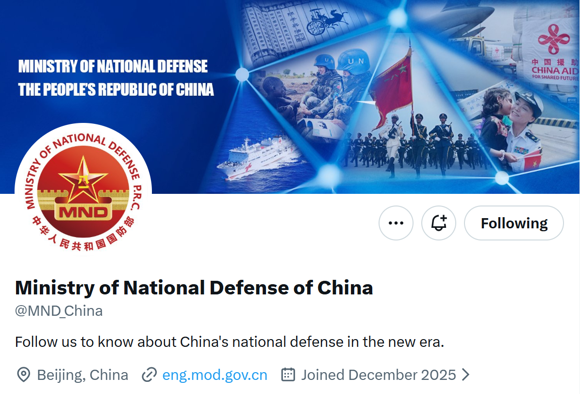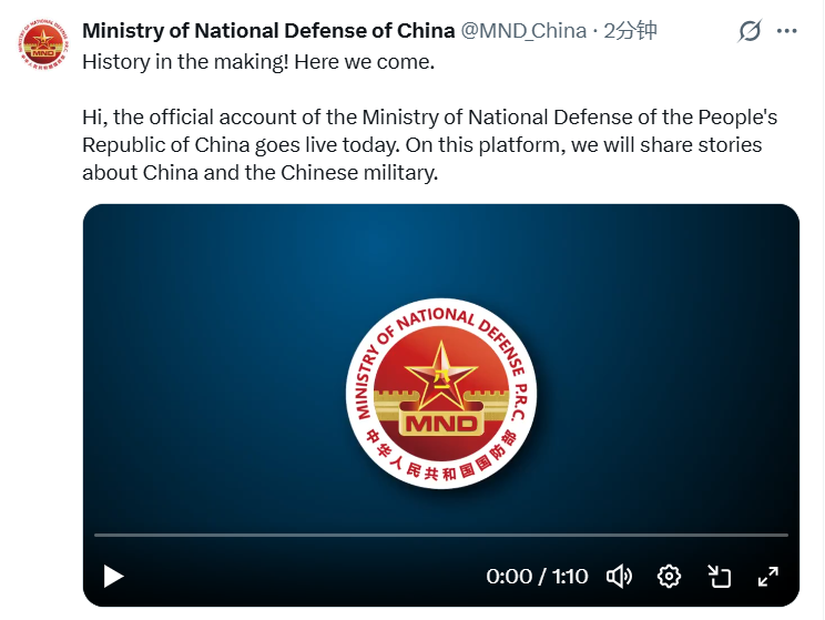 12月8日,中国国防部在海外社交媒体X平台正式开通官方账号。