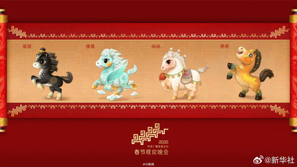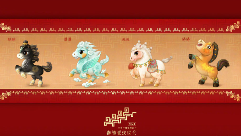 12月18日,中央广播电视总台《2026年春节联欢晚会》发布吉祥物形象。“骐骐”“骥骥”“驰驰”“骋骋”四匹骏马,活泼可爱、意气风发,与晚会主题“骐骥驰骋势不可挡”一脉相承、相得益彰。吉祥物的设计灵感来源于中国不同时期马的经典形象,并将流云纹、山云纹等千年纹样“穿”上身,充盈着生生不息的历史美感和万象更新的时代气象,饱含马到成功、前程似锦的美好寓意。
