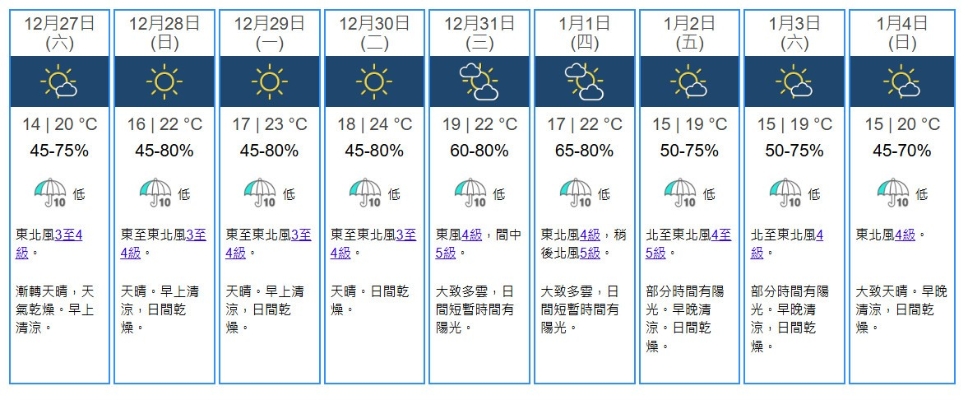 香港天文台料本港地区今日(12月27日)初时大致多云,早上相当清凉。日间渐转天晴,天气乾燥,最高气温约20度。吹和缓东北风。