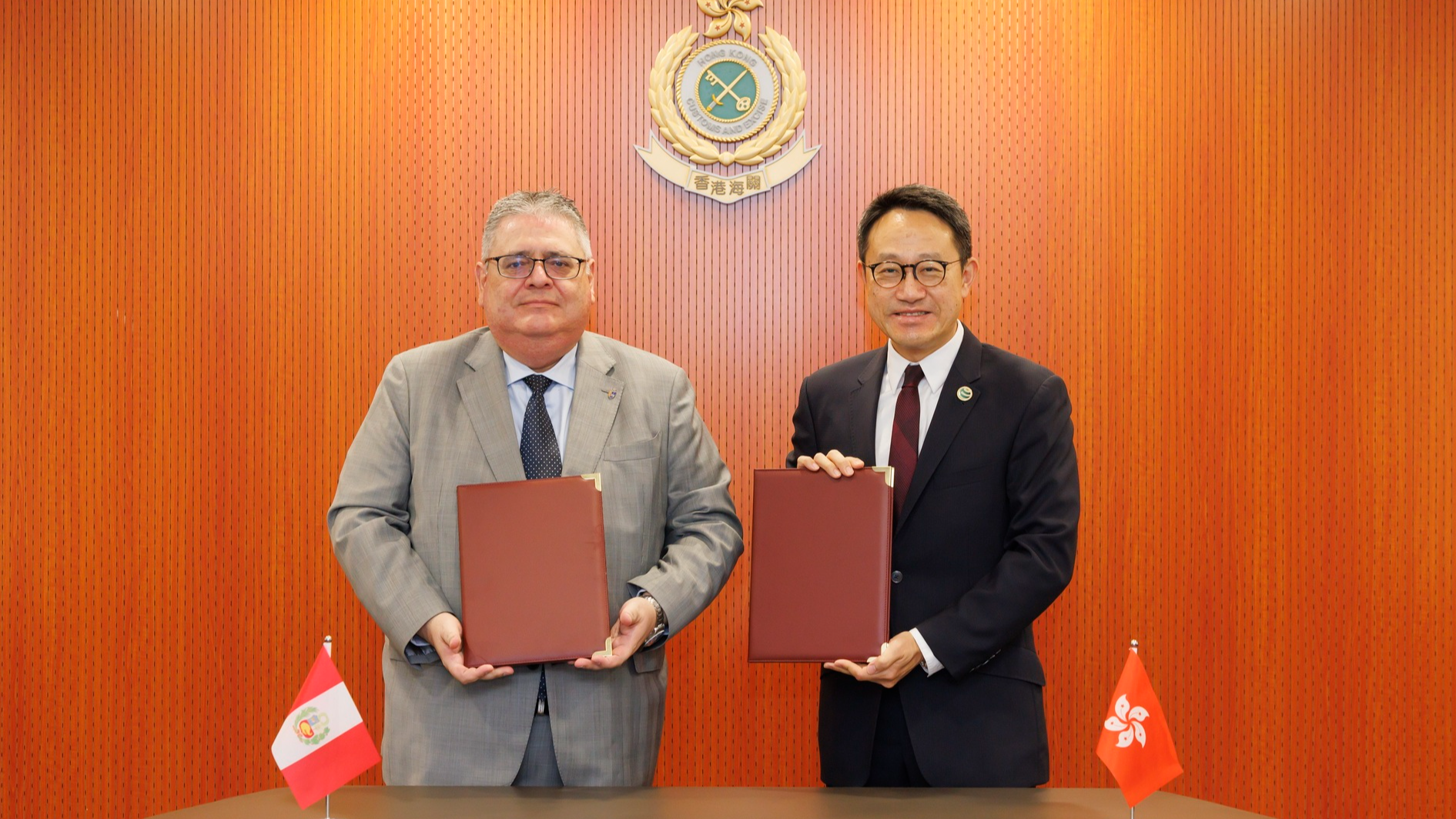 海关关长陈子达今日(30日)在香港海关总部大楼以线上线下模式签订香港海关与秘鲁海关税务总局关于各自“认可经济营运商(AEO)计划”的互认安排,秘鲁驻港总领事Enrique Carlos Cardenas Arestegui亲身到场出席签署仪式,而秘鲁海关税务总局局长Javier Franco Castillo及秘鲁海关税务总局副局长Carlos Adrianzen则在线上见证整个过程。签署完毕后,陈子达随即与Enrique Carlos Cardenas Arestegui交换签署文本。