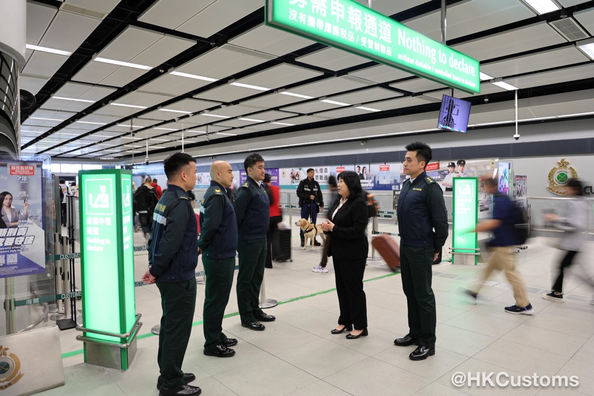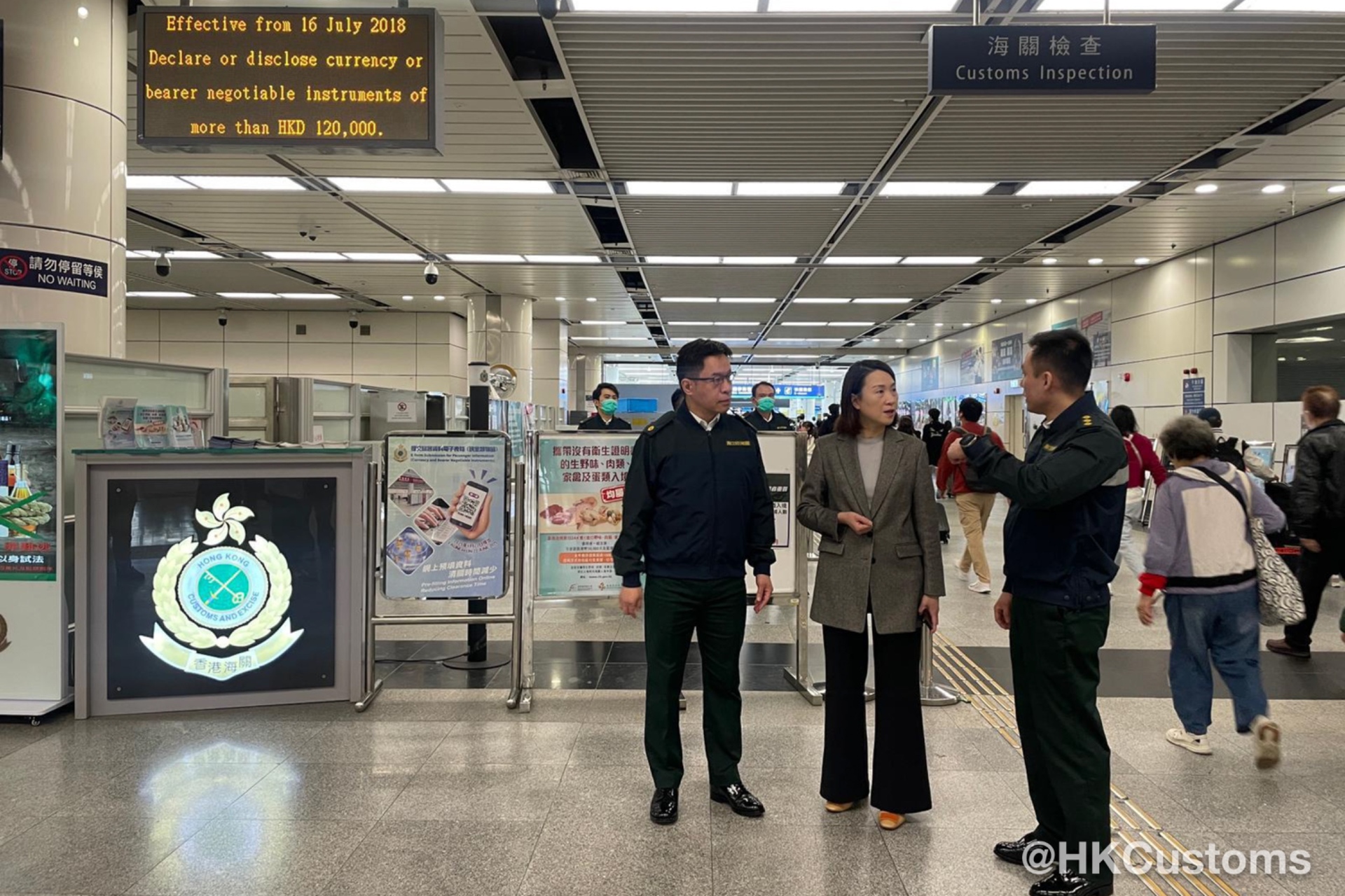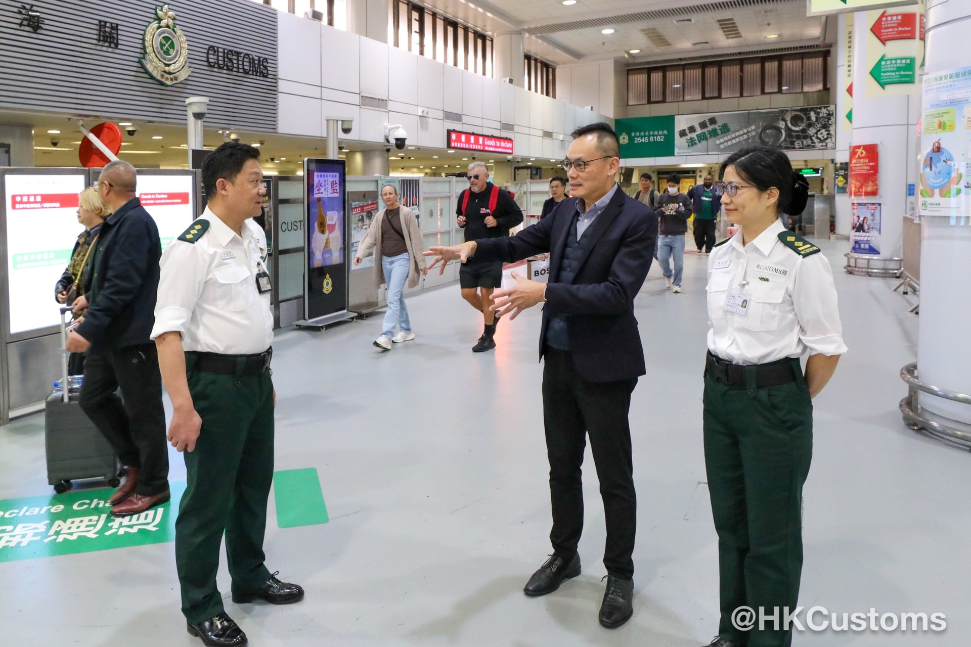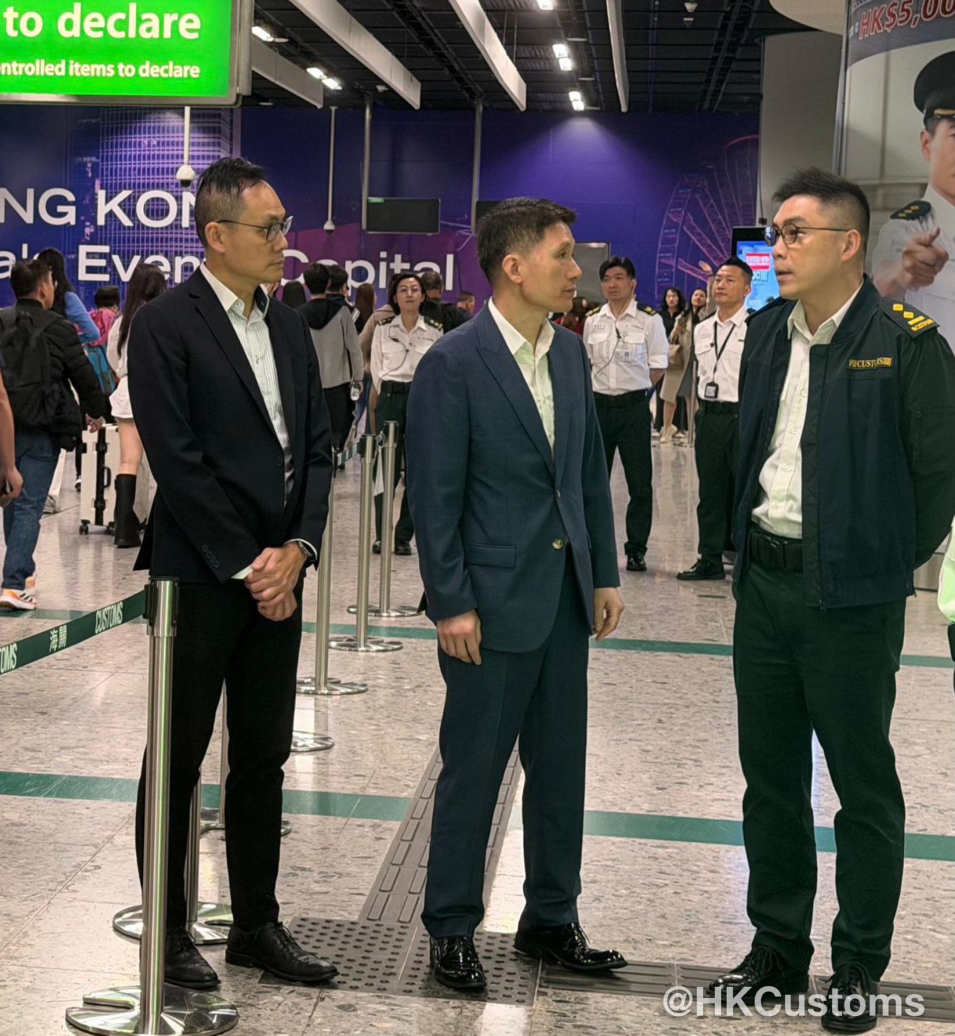 为迎接圣诞节长假期大量市民、访港旅客及跨境车辆使用各口岸,香港海关积极部署,制订一系列措施,确保各口岸通关畅顺。香港海关一众关长级管理层联同各口岸指挥官于十二月二十四日上午亲赴各边境口岸管制站,包括港珠澳大桥香港口岸、香港国际机场、广深港高速铁路西九龙站、深圳湾口岸、香园围管制站、罗湖管制站及落马洲支线管制站等,实地视察通关情况,并为当值前线香港海关同事打气。