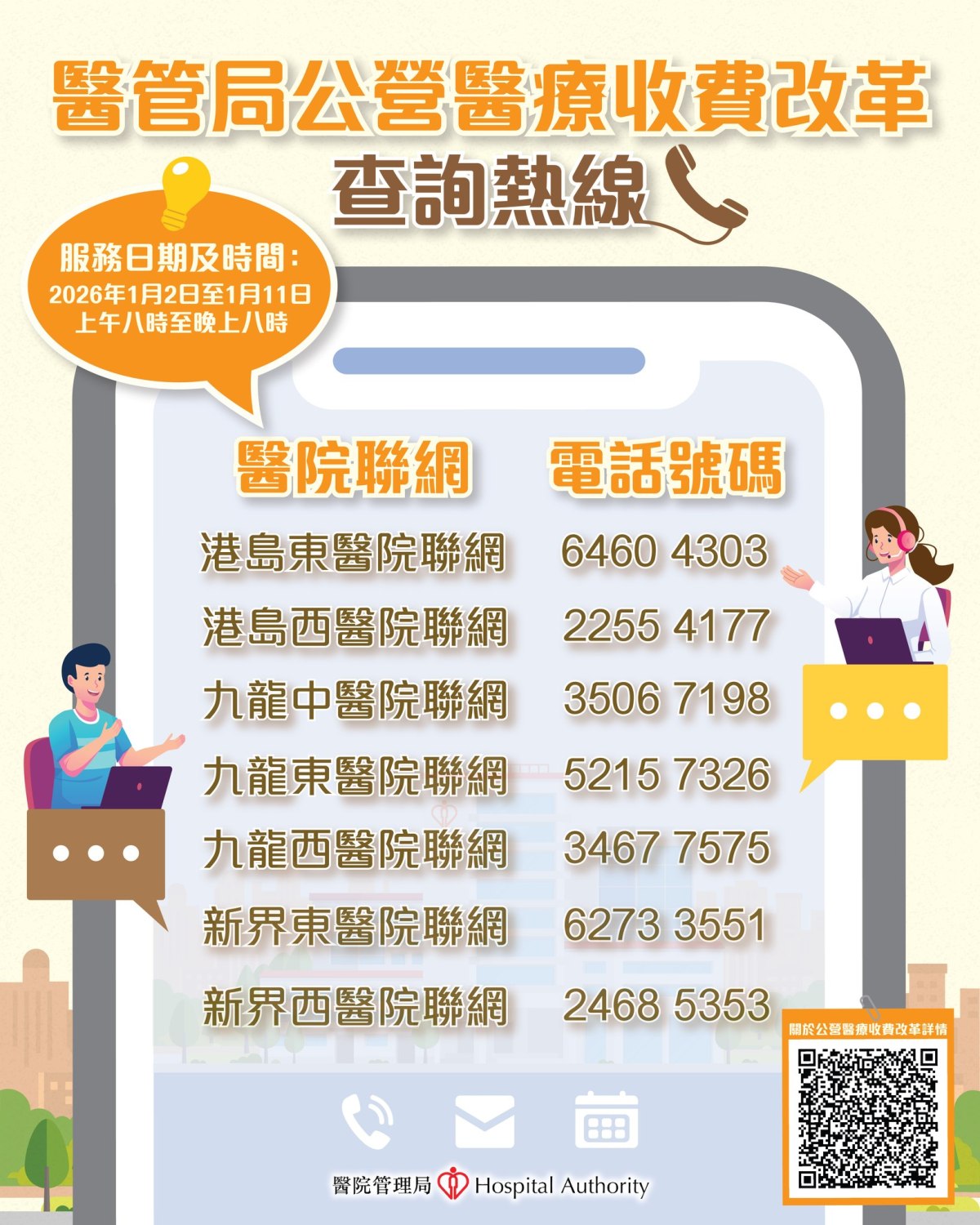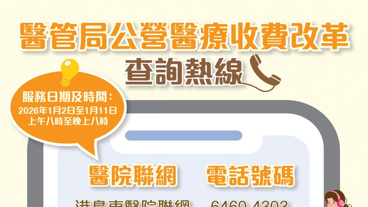 医院管理局1月1日正式推行公营医疗收费改革(收费改革)的各项措施,标志着医管局掀开持续发展的新篇章。医管局今日(1月2日)在社交平台发文表示,医管局公营医疗收费改革查询热线于今日至1月11日提供服务,时间为上午8时至晚上8时。