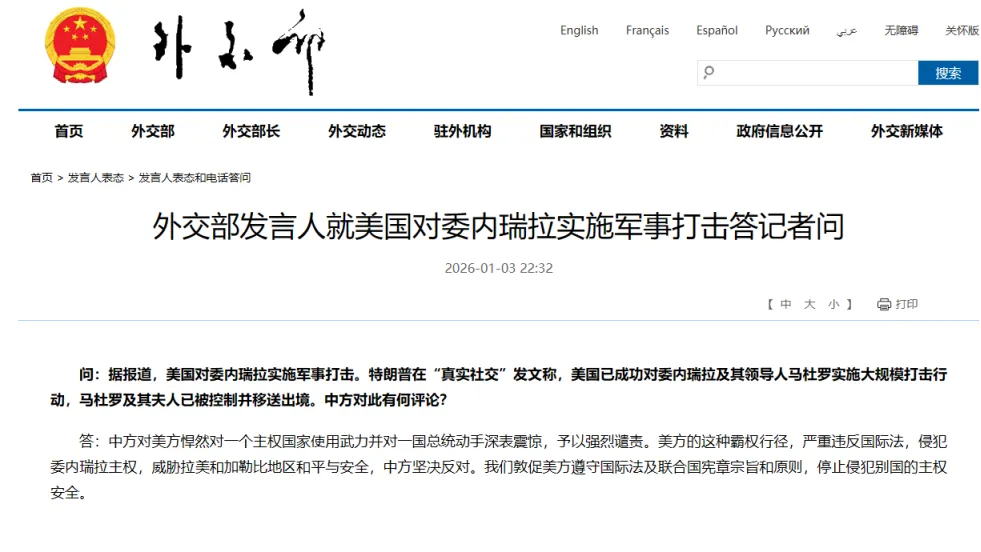 问:据报道,美国对委内瑞拉实施军事打击。特朗普在“真实社交”发文称,美国已成功对委内瑞拉及其领导人马杜罗实施大规模打击行动,马杜罗及其夫人已被控制并移送出境。中方对此有何评论?