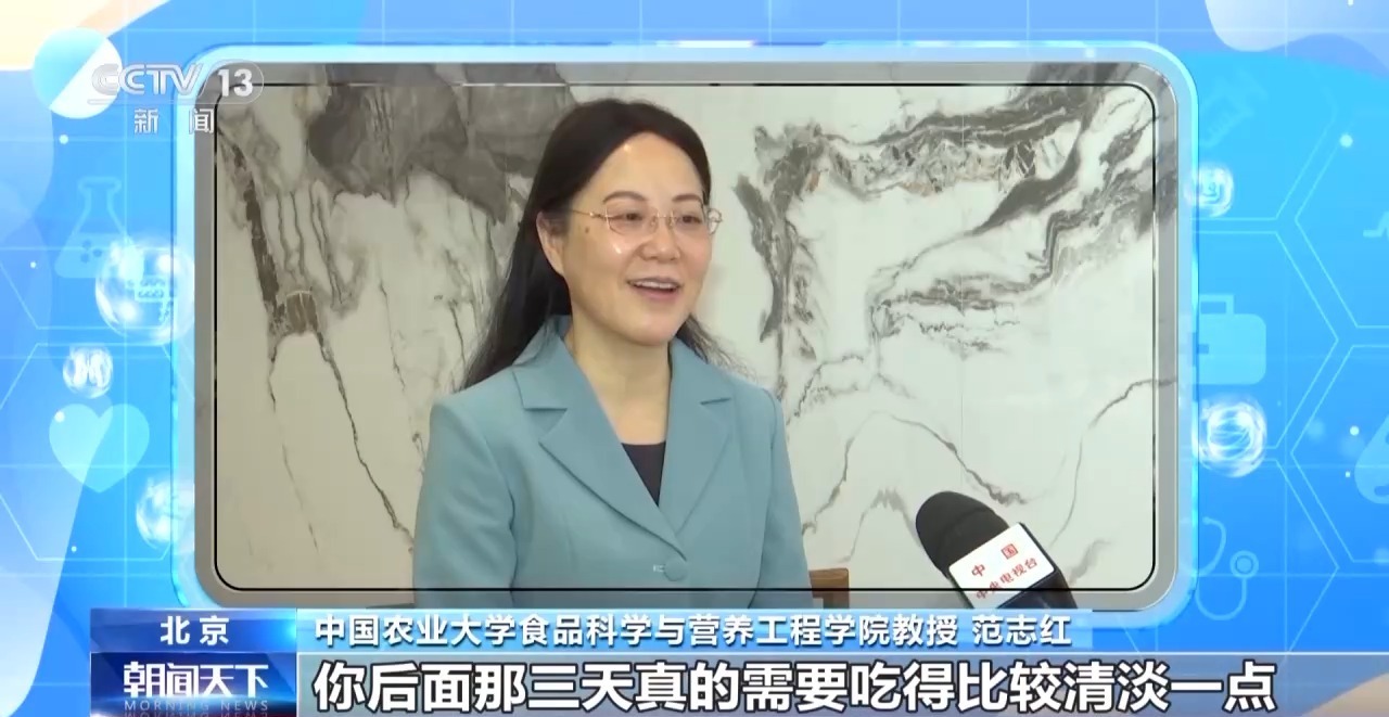 中国农业大学食品科学与营养工程学院教授范志红:过节的时候哪些东西吃多了,比如肉吃多了,那这段时间就减点肉,蛋糕甜点吃多了,那这段时间先节制一下,改成清爽的水果蔬菜。