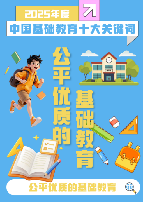 在教育部基础教育司指导下,人民教育杂志面向广大读者征集、遴选“2025年中国基础教育十大关键词”,回顾总结这一年来基础教育领域的热点动态及重要事件。根据读者的投票结果,同时多方征求基础教育领域权威专家意见,最终确定以下“2025年度中国基础教育十大关键词”,现联合新华网、半月谈杂志社、中国教育电视台共同发布。