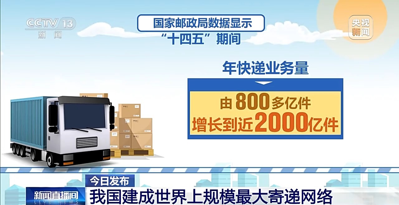 记者从国家邮政局了解到,“十四五”以来,我国建成世界上规模最大、受益人数最多的寄递网络。邮政快递业业务收入年均增长10%,人均年快递使用量翻一番。