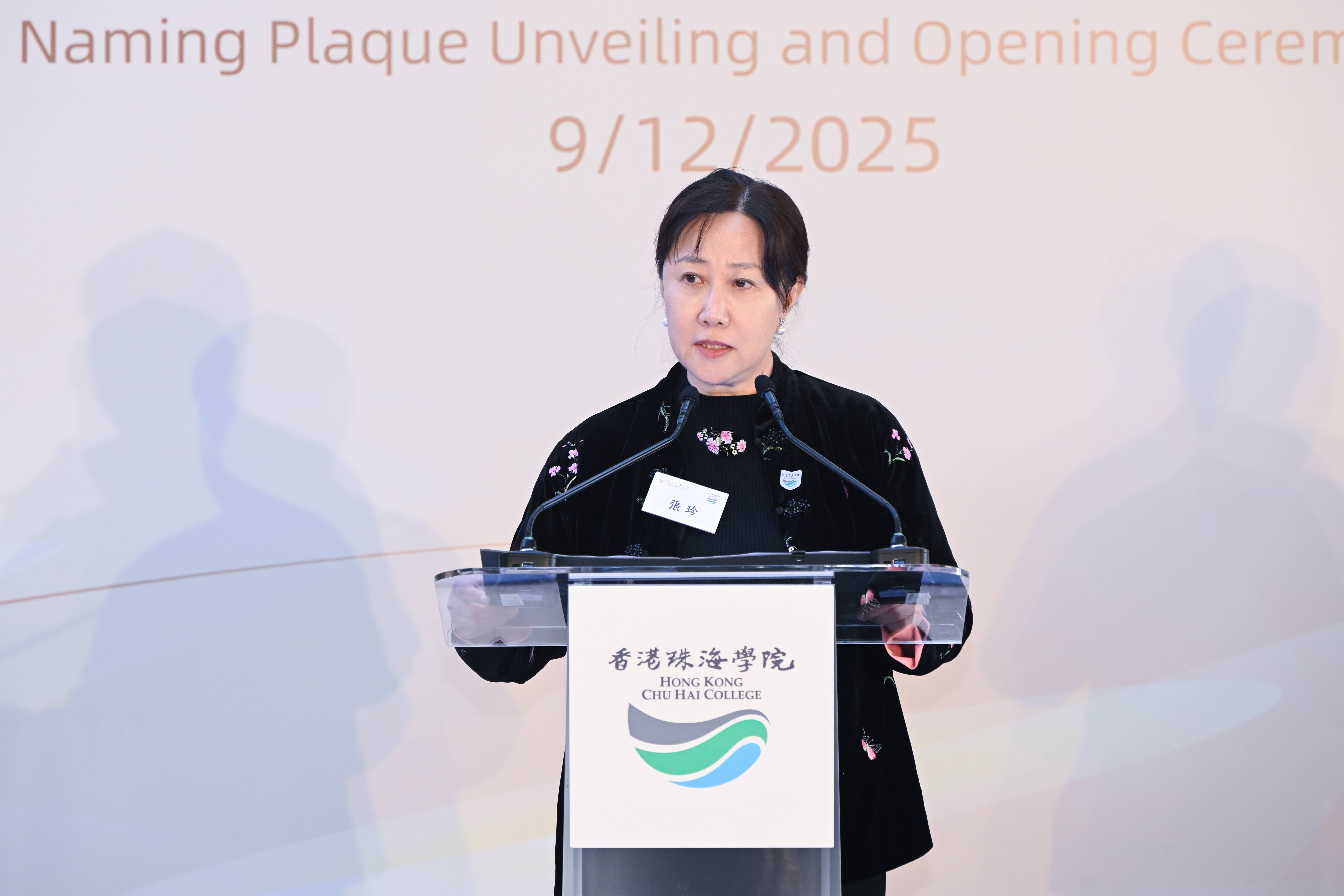 典礼由香港珠海学院发展总监谢易霖先生主持。在典礼正式开始前,全场肃立默哀一分钟,悼念大埔宏福苑火灾罹难者。默哀仪式结束后,张珍署理校长致欢迎及感谢辞。她表示,陈守仁基金会始终秉持“取之于社会,用之于社会”的崇高理念,坚守“百年大计,教育为本”的信念,陈守仁家族数十年如一日鼎力支持高等教育事业。此次基金会慷慨捐资支持学院三项重要设施的命名,这份信任既是对学院办学方向与教育质量的高度认可,更是对学院培养新一代青年、推动两岸及国际交流工作的殷切期望。