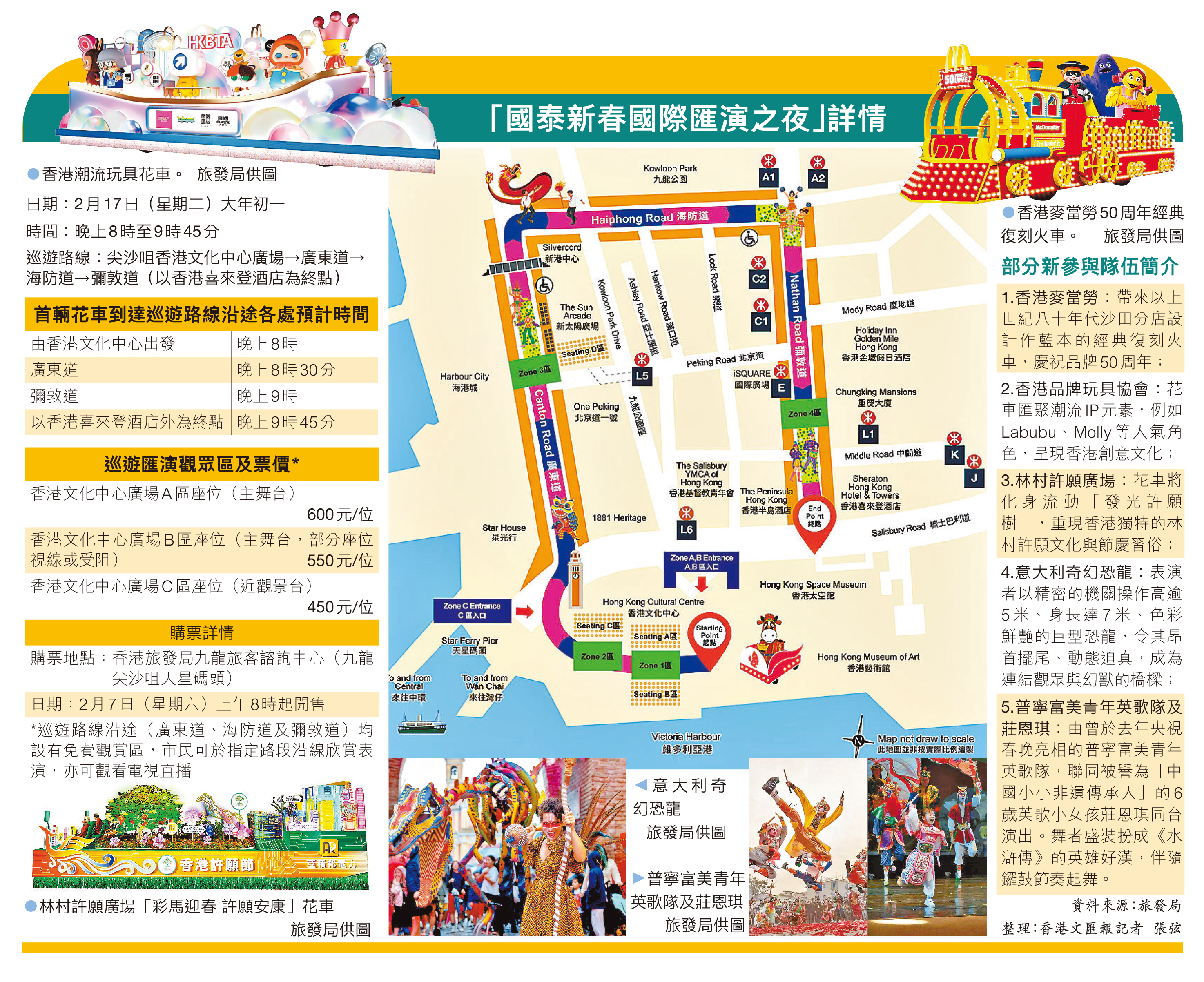 农历新年即将来临,当中的重头戏“国泰新春国际汇演之夜”将于大年初一(2月17日)上演。今年有近60队来自香港、内地及海外的花车及队伍参与表演,更有不少新元素和首次参与队伍,包括香港麦当劳、林村许愿树、曾在央视春晚演出的普宁富美青年英歌队和6岁英歌小女孩庄恩琪等,首次在此活动亮相。旅发局预计届时有10万人到场观赏,其中一半是旅客。