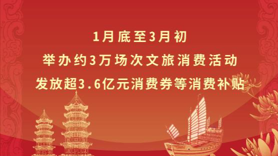 消费月将从1月底持续至3月初,其间各地将围绕年俗、演出、展览、冰雪游、避寒游、亲子游等热点,推出丰富多彩的应季文旅产品和活动,举办约3万场次文旅消费活动,发放超3.6亿元消费券等消费补贴,推出门票减免、票根联动优惠、跨区域文旅优惠等举措,加大直达居民游客的普惠政策力度,为人民群众欢度新春提供更多文旅选择。