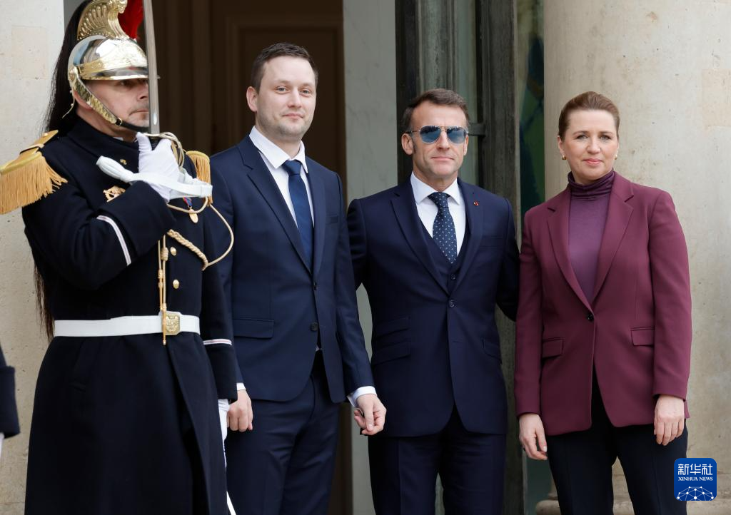 1月28日,法国总统马克龙(右二)在巴黎欢迎到访的丹麦首相弗雷泽里克森(右一)和格陵兰岛自治政府总理延斯-弗雷德里克·尼尔森(左二)。