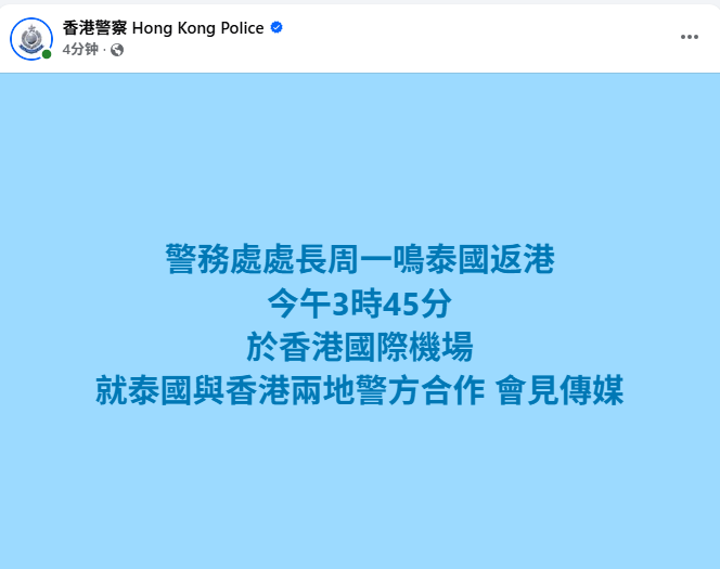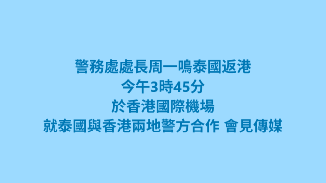一名62岁的香港男子日前在曼谷被泰国警方拘捕,涉嫌与37年前在香港发生的一宗谋杀案有关,该名男子下午将抵达香港。警务处在社交平台发文表示,警务处处长周一鸣今日(5日)从泰国返回香港,将于下午3时45分在香港国际机场会见传媒,交代泰国与香港两地警方合作的相关事宜。