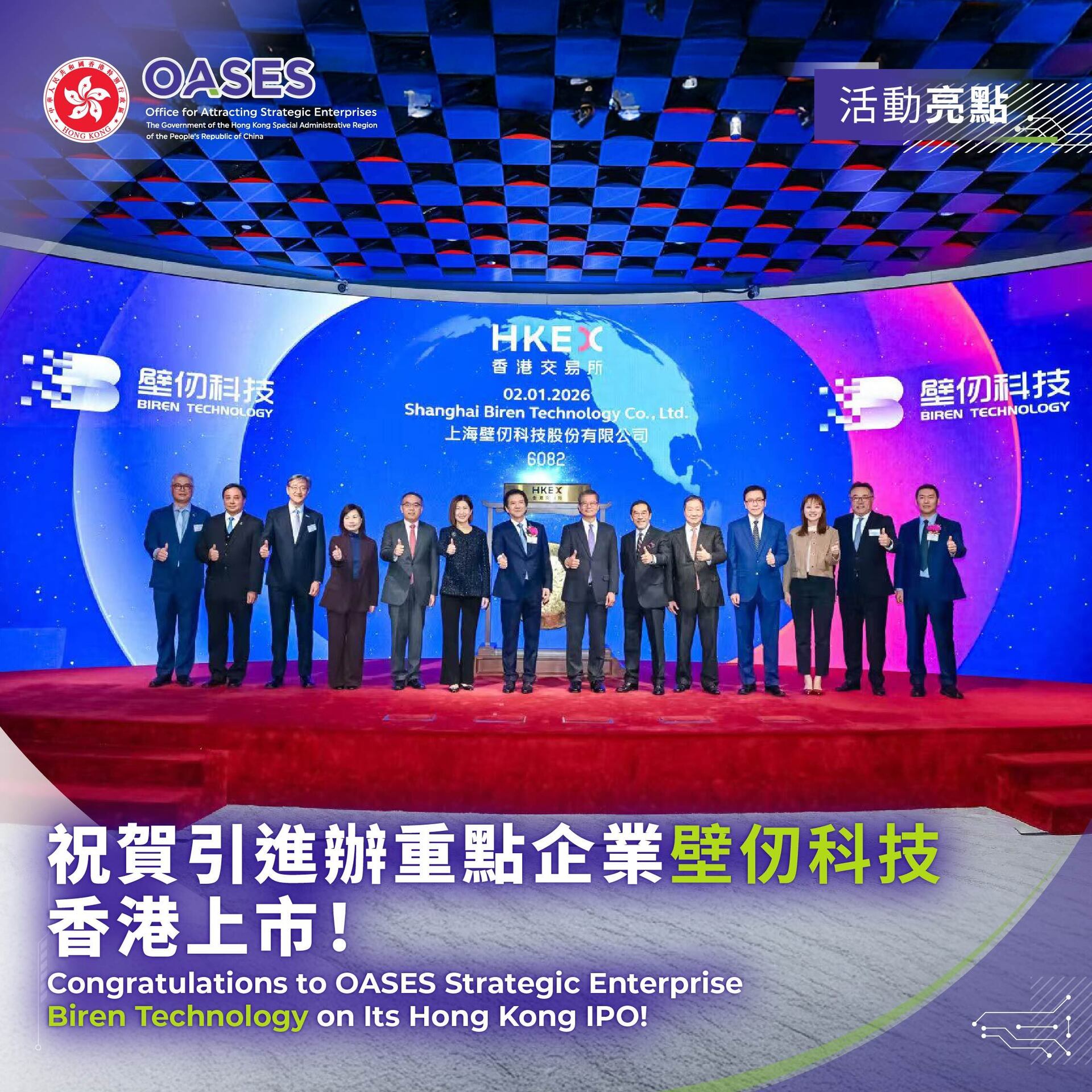 引进重点企业办公室(引进办)衷心祝贺我们的重点企业——壁仞科技(Biren Technology)早前于香港交易所主机板成功挂牌上市。这不仅是企业业务发展历程中的重大里程碑,更为香港的人工智慧产业与算力生态建设注入了强劲动力。