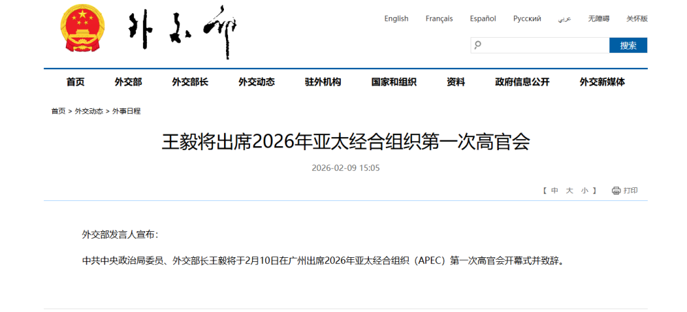 外交部发言人宣布:中共中央政治局委员、外交部长王毅将于2月10日在广州出席2026年亚太经合组织(APEC)第一次高官会开幕式并致辞。