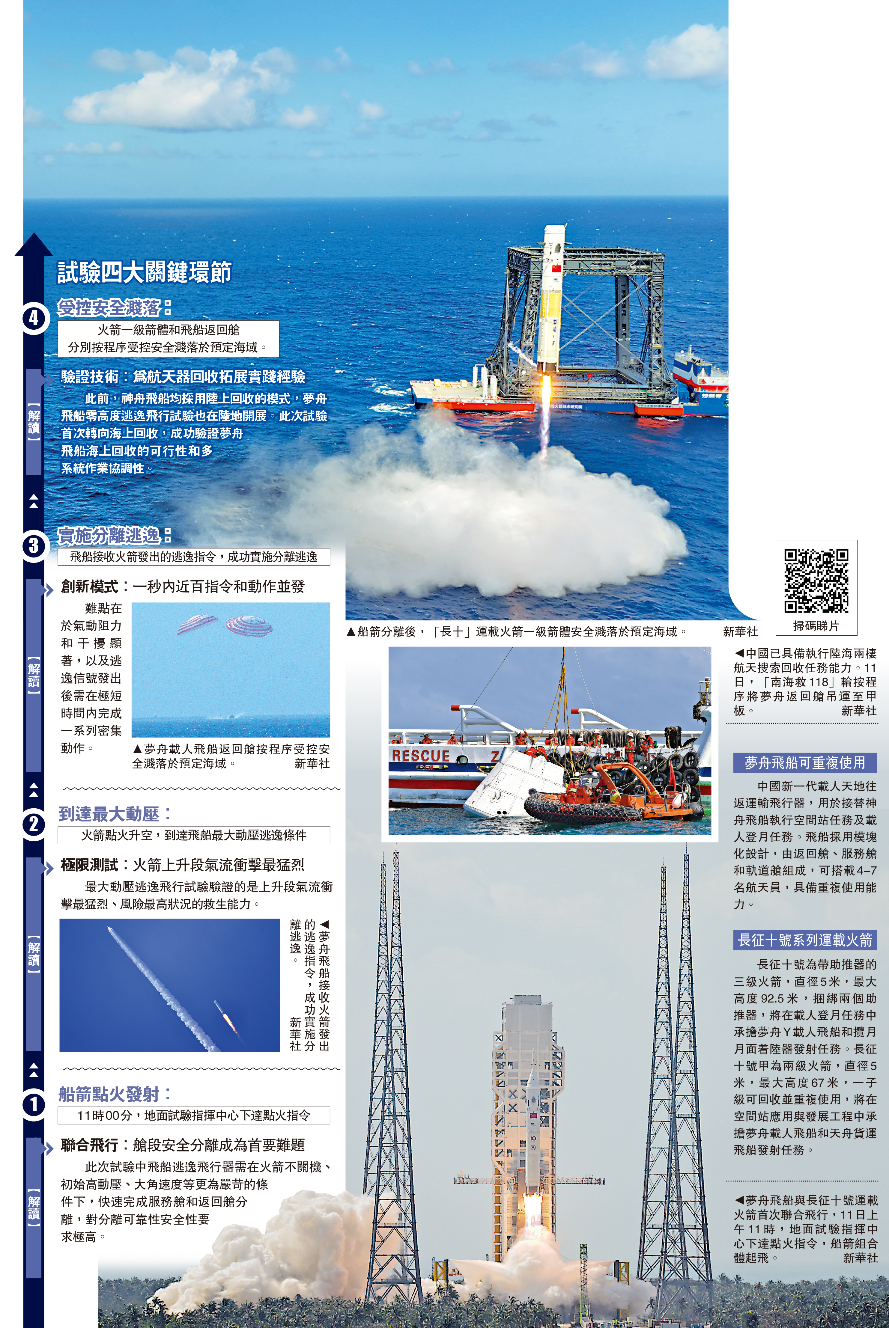 据报道,11日11时,地面试验指挥中心下达点火指令,火箭7台发动机中的5台同时点火,船箭组合体起飞。飞行约65秒达到最大动压条件,船箭实施分离。逃逸塔带动梦舟飞船快速脱离,顺利完成最大动压逃逸试验,随后按预定轨迹落入指定海域。同时,火箭一级继续上升段飞行。飞行约151秒,火箭抵达约105公里高度,发动机熄火,一级开始再入返回流程。飞行约350秒,火箭重启两台发动机,实施动力减速,为再入大气层做准备。飞行约410秒,一级进入稠密大气层,两台发动机关机,转入气动减速阶段。此后,进入精确着陆段,三台发动机再次点火后,关闭两台发动机,靠中心的一台发动机再进行最后的机动,大概工作三四十秒,软着陆于预定海域。11日12时20分,海上搜救分队完成返回舱搜索回收任务。
