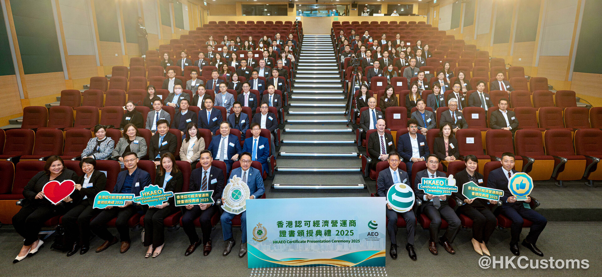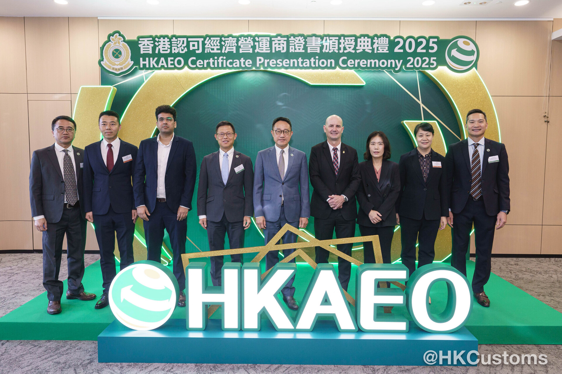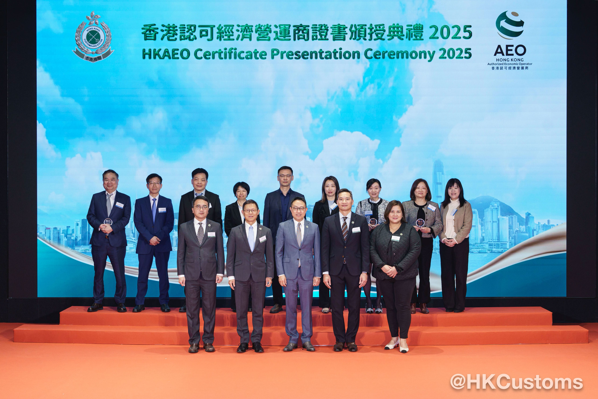 香港海关于二月五日在海关总部大楼举行“香港认可经济营运商证书颁授典礼2025”,共约120位嘉宾出席,包括中联办代表、外国海关专员、香港AEO成员、商界和业界代表。在典礼上,海关除了向获新认证和成功续期的AEO颁发证书外,亦向9间AEO企业颁授“香港认可经济营运商伙伴计划”年度奖项,以表扬该企业在推广香港AEO计划及于其他海关合作事务上的卓越表现。当中金奖得主包括:爱普生香港有限公司、香港华为国际有限公司和利记国际有限公司,其代表更于典礼上分享得奖心得及成为香港AEO后对企业带来的好处。