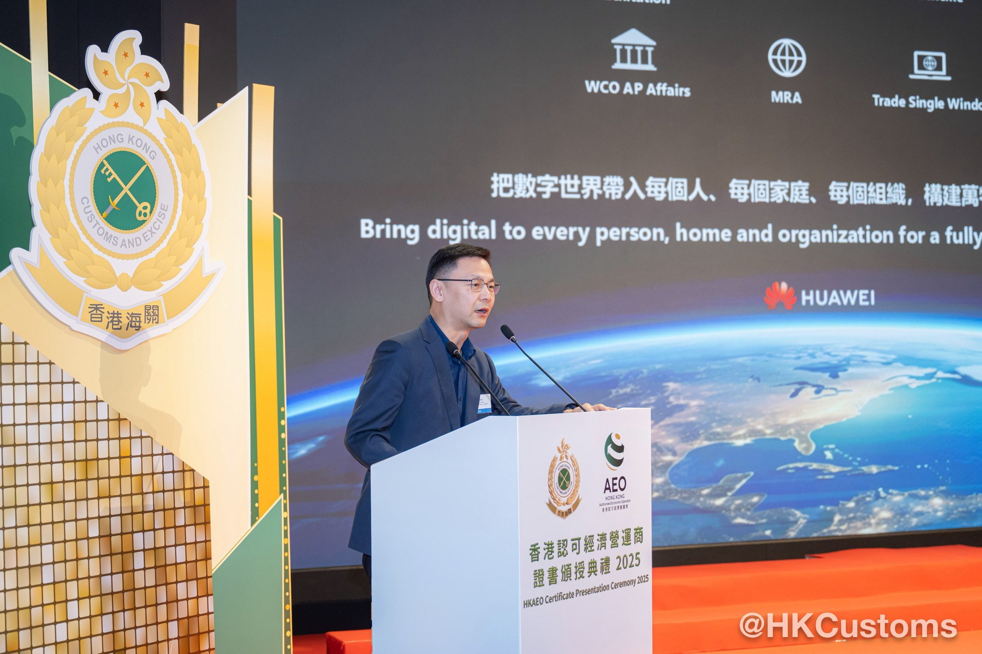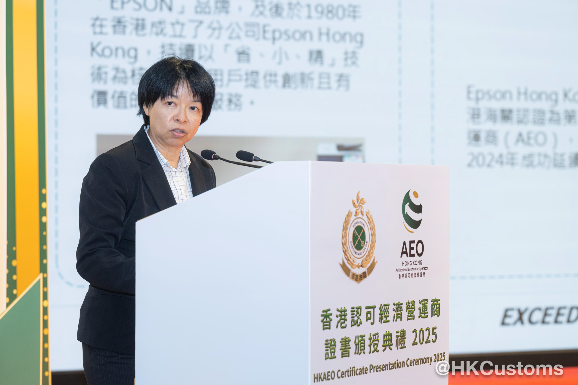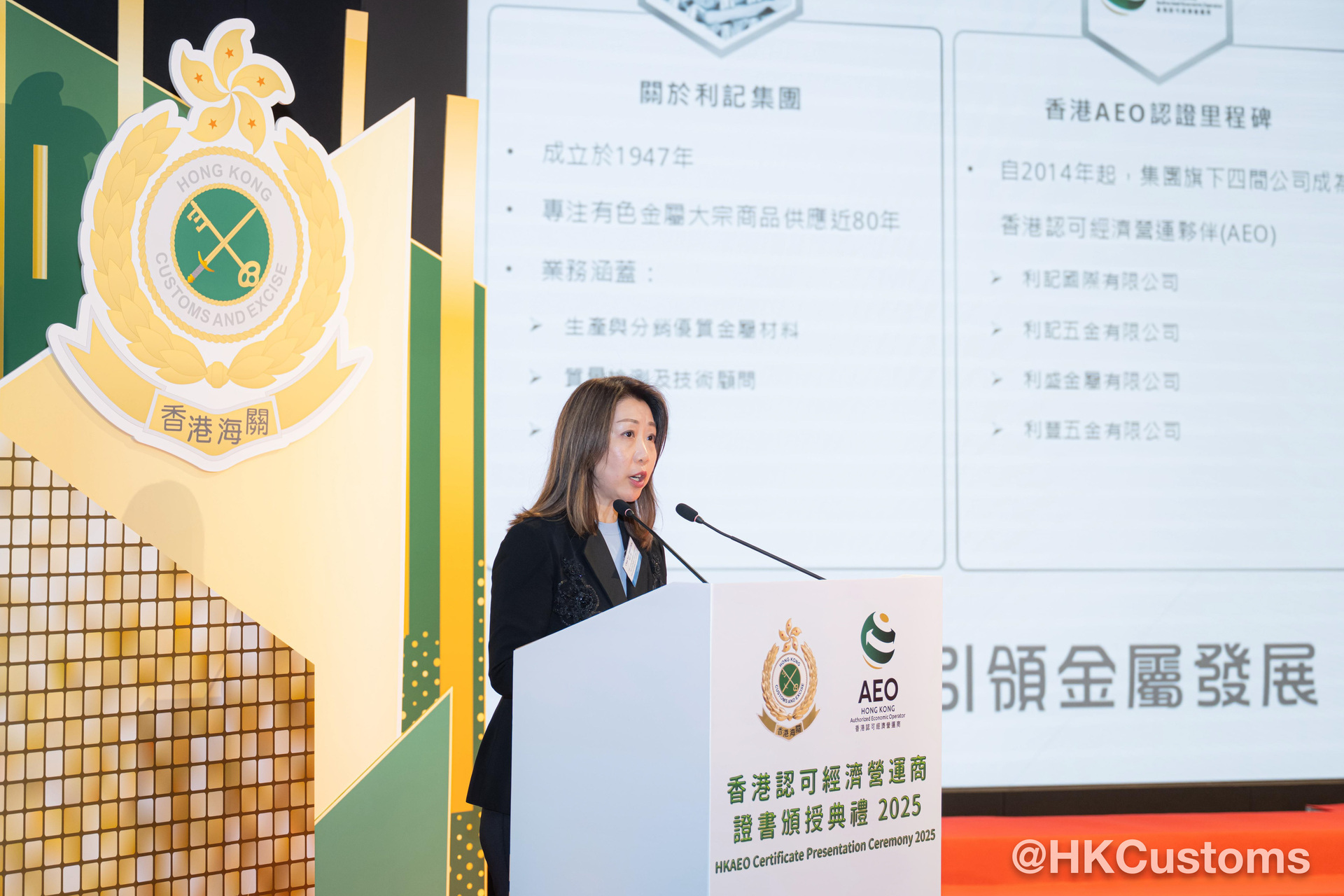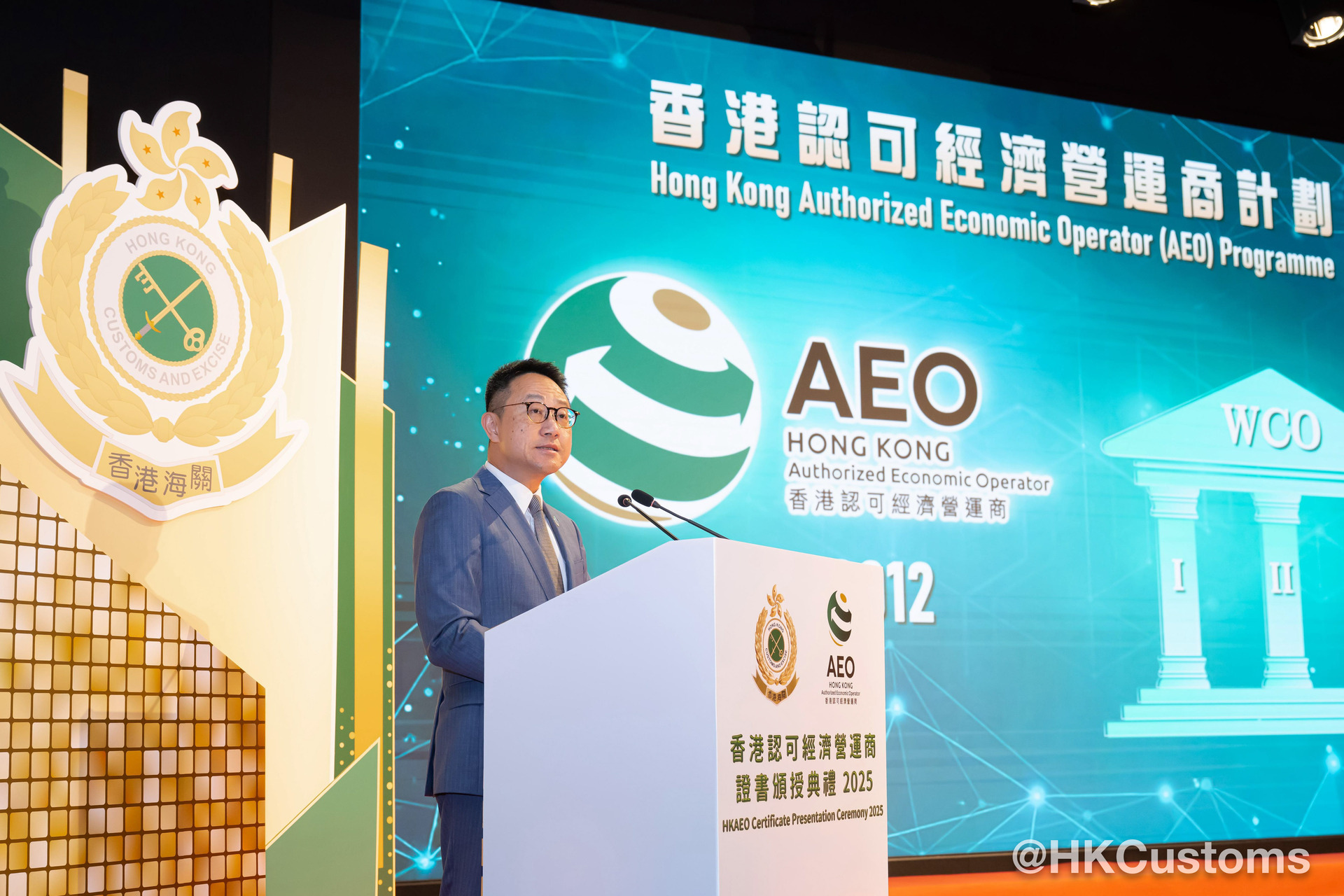 香港海关于二月五日在海关总部大楼举行“香港认可经济营运商证书颁授典礼2025”,共约120位嘉宾出席,包括中联办代表、外国海关专员、香港AEO成员、商界和业界代表。在典礼上,海关除了向获新认证和成功续期的AEO颁发证书外,亦向9间AEO企业颁授“香港认可经济营运商伙伴计划”年度奖项,以表扬该企业在推广香港AEO计划及于其他海关合作事务上的卓越表现。当中金奖得主包括:爱普生香港有限公司、香港华为国际有限公司和利记国际有限公司,其代表更于典礼上分享得奖心得及成为香港AEO后对企业带来的好处。