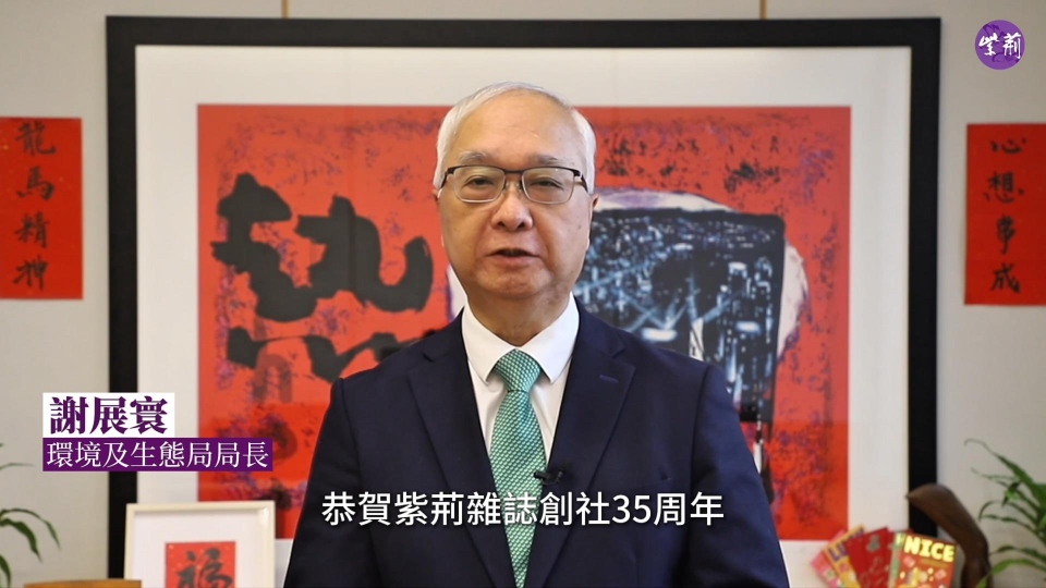 在紫荆杂志社成立35年之际,香港环境及生态局局长谢展寰为杂志社送上祝福,他恭贺紫荆杂志创社35周年!他说,紫荆35年来倡导绿色发展,关注生态建设,助力打造香港宜居城市。愿紫荆杂志继续为香港生态美好贡献力量。