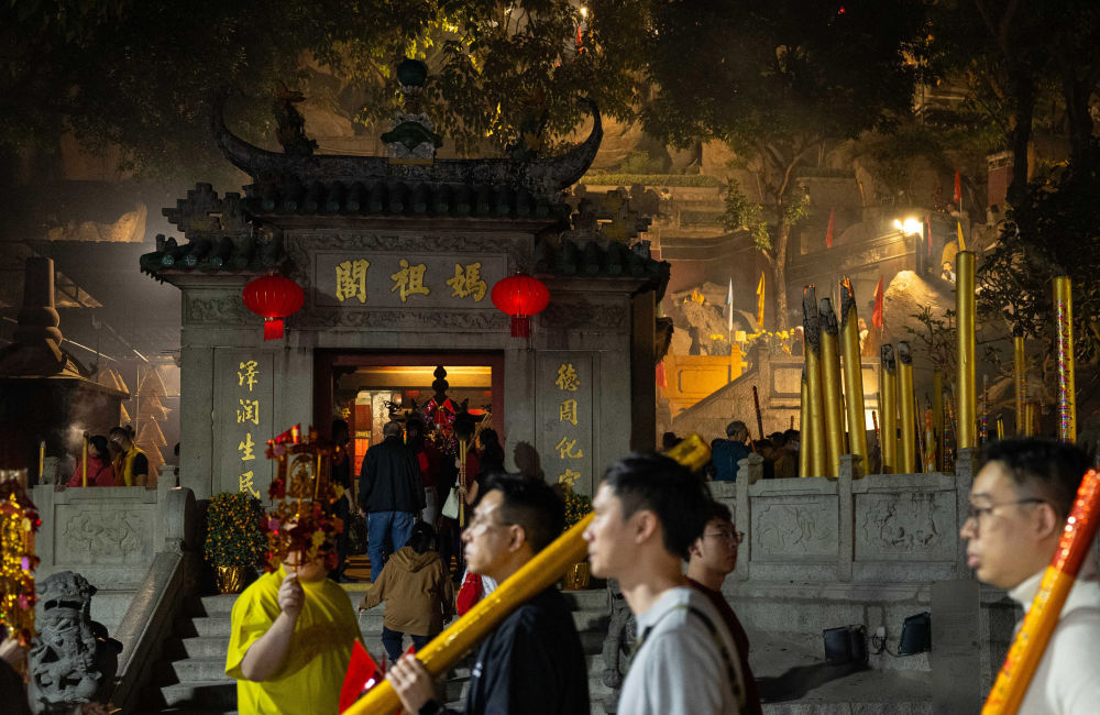 不多时,金龙行至妈阁庙。耳边锣鼓喧闹,眼前香火袅袅。在澳门,去妈阁庙进香是不少市民新年行事历中的重要事项。从除夕夜开始,前来祈福的民众络绎不绝,小小庙宇挤得水泄不通。