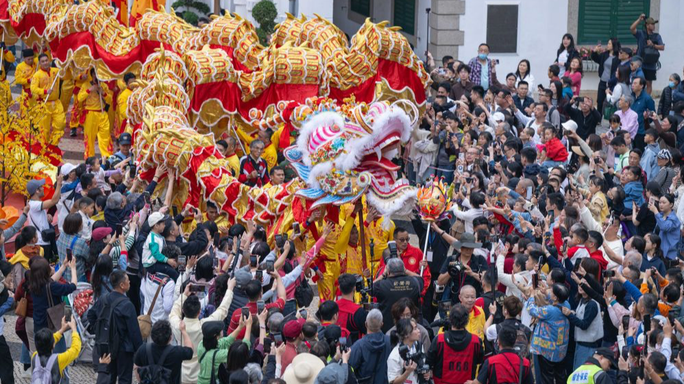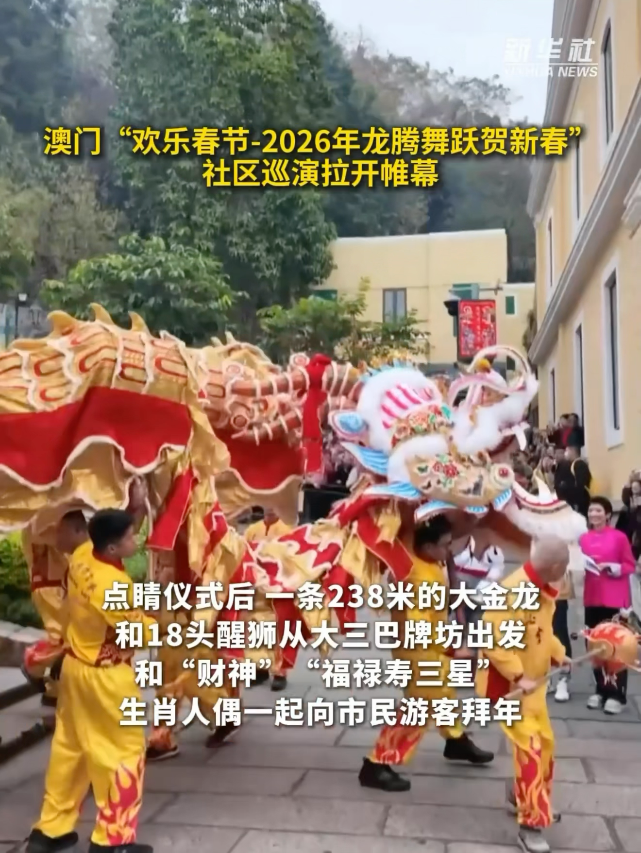 早春时节,暖意融融。澳门大三巴牌坊前,“财神”和“金童玉女”热情招呼着翘首以盼的路人,送上丙午马年的祝福。一旁,一条长逾230米的金色“巨龙”正蓄势待发。