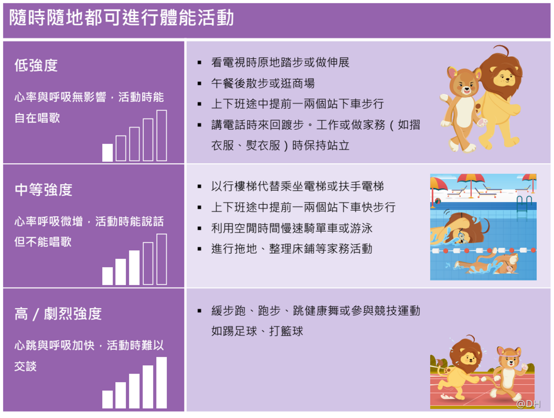 研究显示,定期进行体能活动有助防控非传染病,例如三高(高血压、高血糖和高血脂)、心脏病、中风及大肠癌和乳癌等常见癌症,还有利于控制体重、增强免疫力和改善心理健康。在安全情况下进行任何形式的体能活动,都有益身心。其中,中等至剧烈强度的运动对提升心肺功能尤其有效。最新研究亦指出,每日仅5分钟的中等强度运动,也可降低死亡风险。因此,勿以善小而不为。别再等,今天开始运动,把体能活动融入生活中。