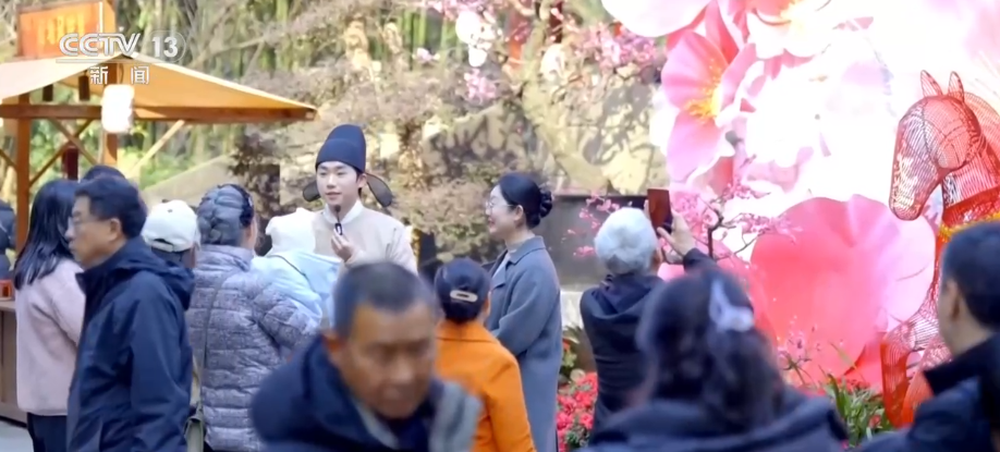 四川成都杜甫草堂花色正浓,30米梅花造型飞瀑凌空倾泻,繁花相映间再现“花重锦官城”的盛景。讲解员扮演“杜甫”现身花间,与游客现场对诗互动。
