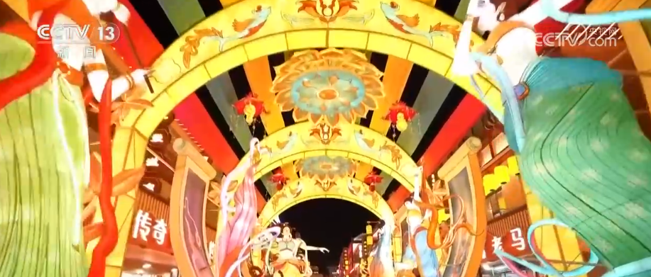 在甘肃,敦煌新春文化市集上,1200余件承载着丝路文化特色的花灯,点亮了新春的夜空。造型取材于反弹琵琶、三兔共耳等敦煌壁画经典意象融入灯组设计。大家身着汉服,赏花灯、踢毽子,感受博大精深的中华传统文化。