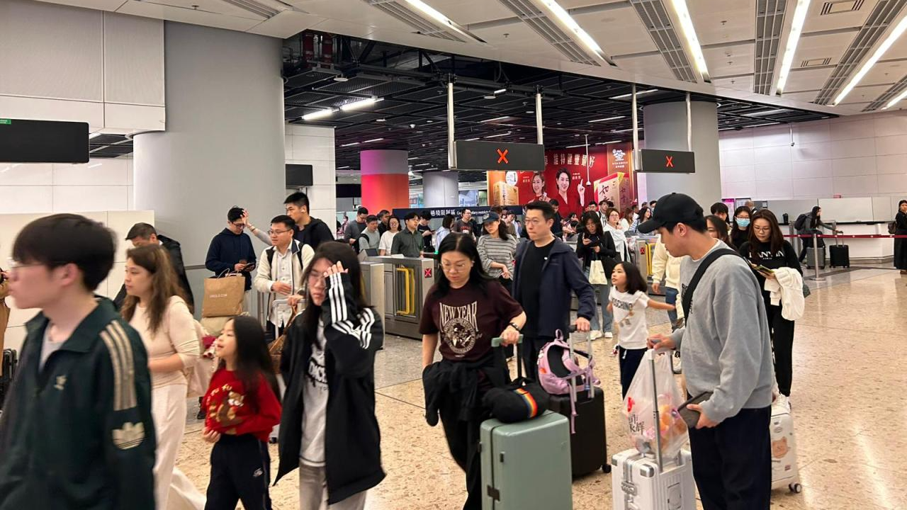 在高铁西九龙站,抵港人流不断,不少市民一家大小到内地过年后,拖著行李返港。