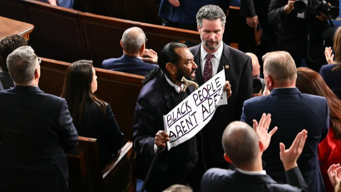 美国总统特朗普24日在国会发表国情咨文演讲时,得克萨斯州民主党众议员艾尔·格林因抗议被带离场。