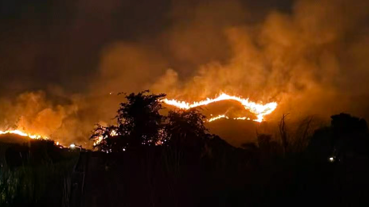 26日下午,香港粉岭坪輋一带有山头起火,火线长约百米。