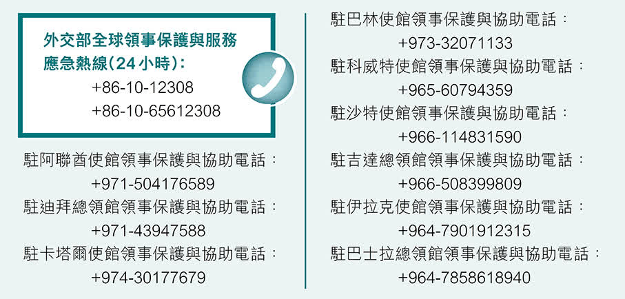 入境处表示,在获悉事件后,已即时透过外交部驻香港特别行政区特派员公署、中国驻卡塔尔大使馆、中国驻阿拉伯联合酋长国大使馆、中国驻沙特阿拉伯王国大使馆、中国驻巴林王国大使馆、中国驻约旦哈希姆王国大使馆及旅游业监管局了解情况。